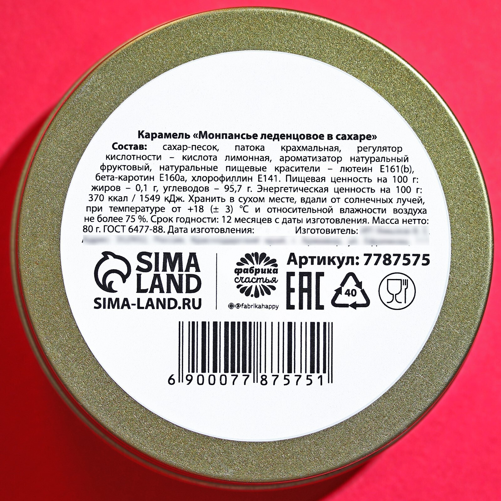 Состав: сахар-песок, патока крахмальная, регулятор кислотности – кислота лимонная, ароматизатор натуральный фруктовый, натуральные пищевые красители – лютеин Е161(b), бета-каротин Е160a, хлорофиллин Е141.