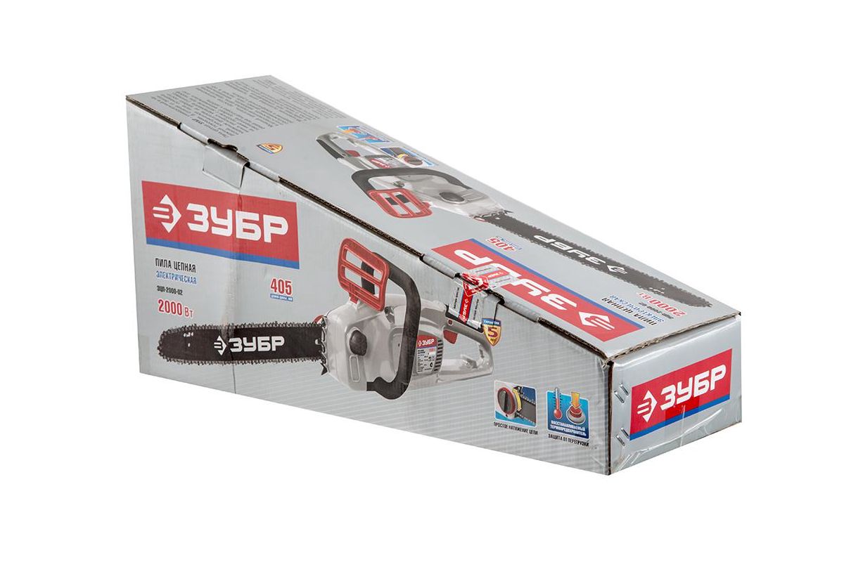 ЗУБР ЗЦП-2000-02 - универсальный и надежный помощник для валки деревьев, а так же пиления веток, обрезки сучьев, пиления деревянных бревен и пр. В отличие от бензиновой, электрическая пила оснащена надежным двигателем, не требует постоянных расходных материалов (топлива), не имеет проблем с запуском при любой температуре, требует минимальных операций при подготовке к работе. Мощный двигатель, простое натяжение и дозированная смазка цепи, практически отсутствующая вибрация, минимальное обслуживание делают пилу легкой в обращении и комфортной в работе. Мгновенная остановка цепи, приводимая в действие при откидывании защитного щитка, а также встроенный цепеуловитель и металлический упор способствуют безопасности применения.