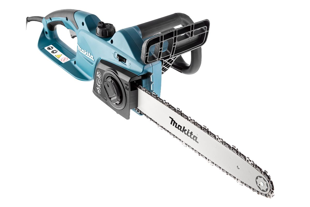 MAKITA UC4041A – электрическая цепная пила. Мощность 1800 Вт, длина шины – 40 см. Подойдёт для заготовки дров, распила стройматериалов, валки деревьев или обрезания веток. Работает от бытовой сети 220 В.