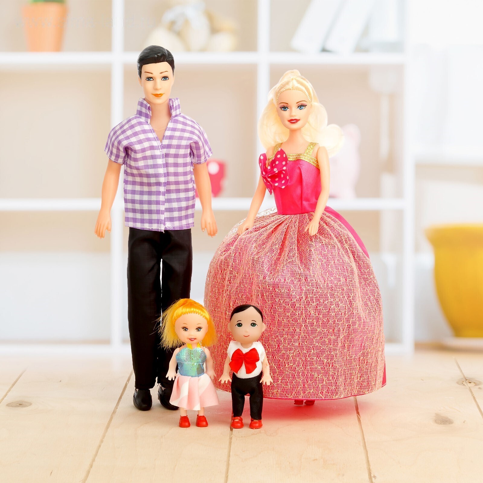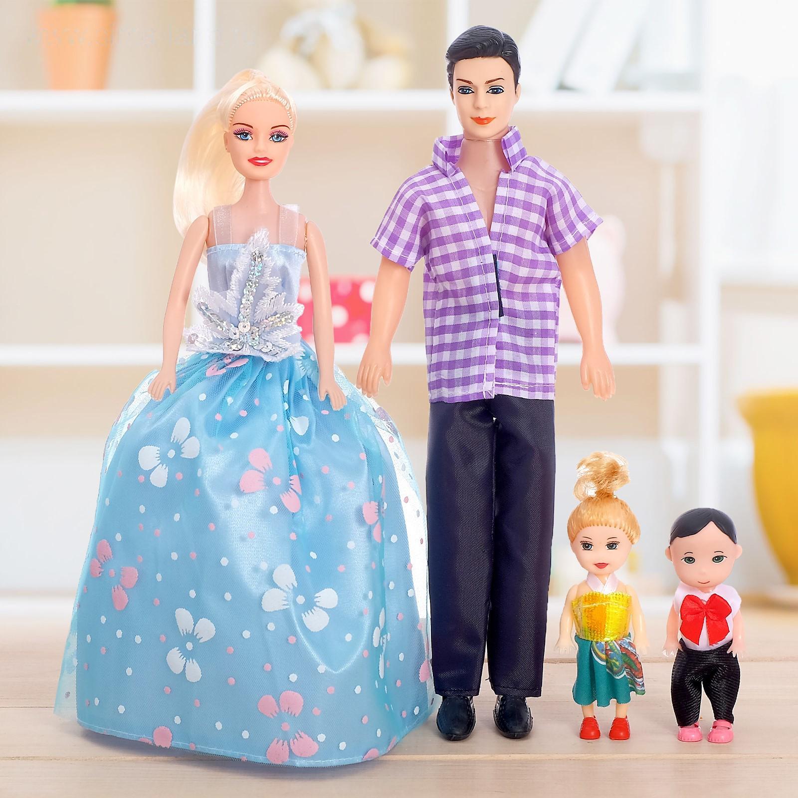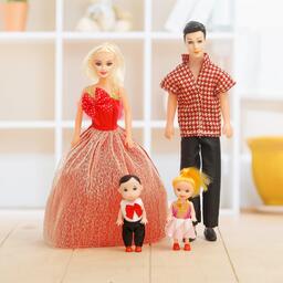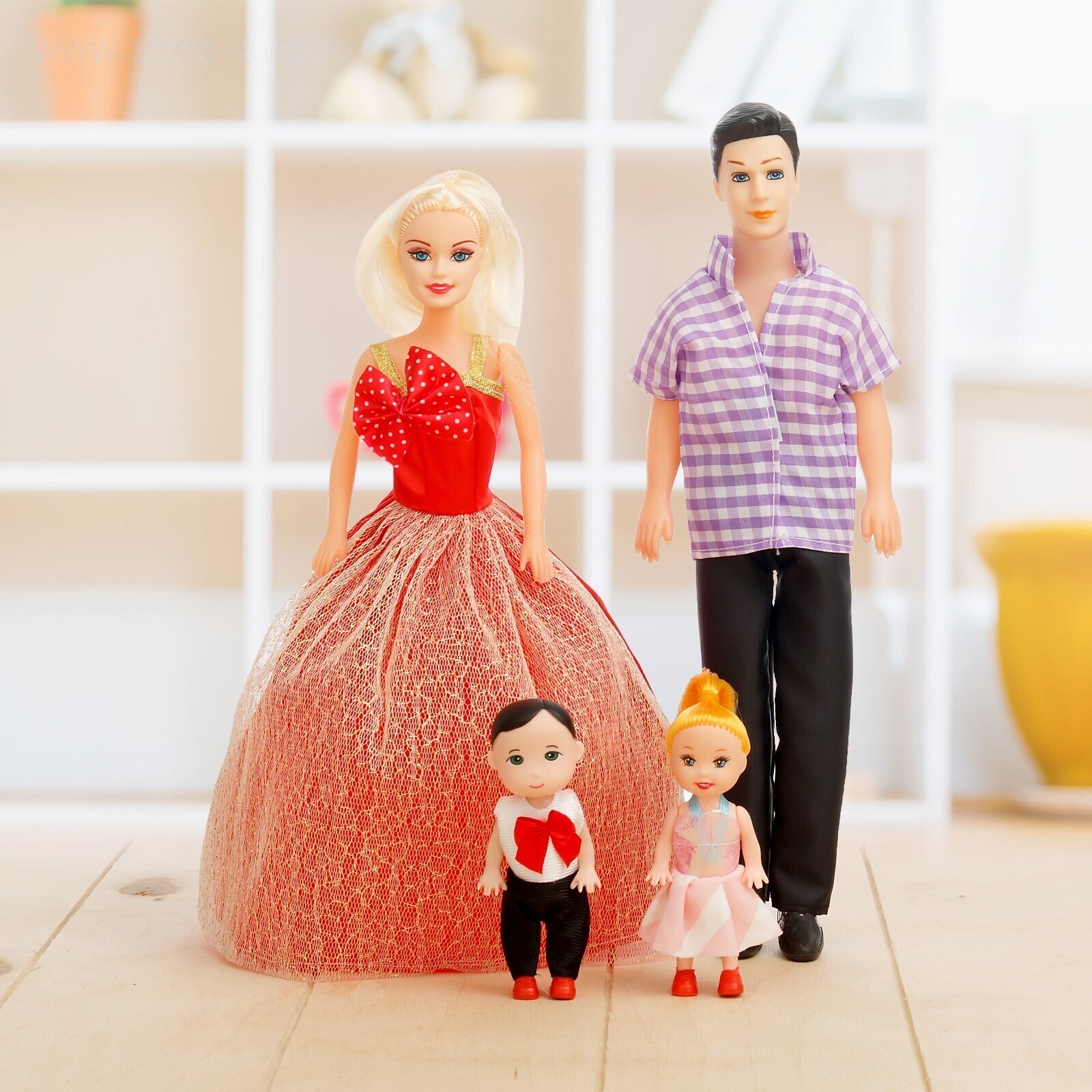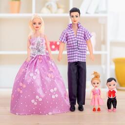 Порадуйте ребёнка кукольной семьёй. В наборе есть кукла-папа высотой 29 см, кукла-мама высотой 26 см, куклы-малышки высотой по 10 см. У мамы длинные волосы. Игрушки выполнены из пластика, одежда снимается, шарнирные.