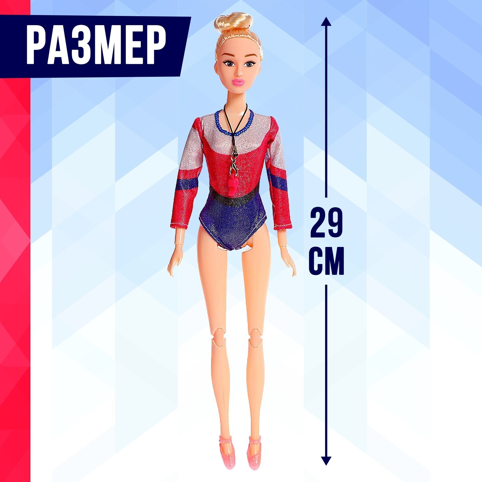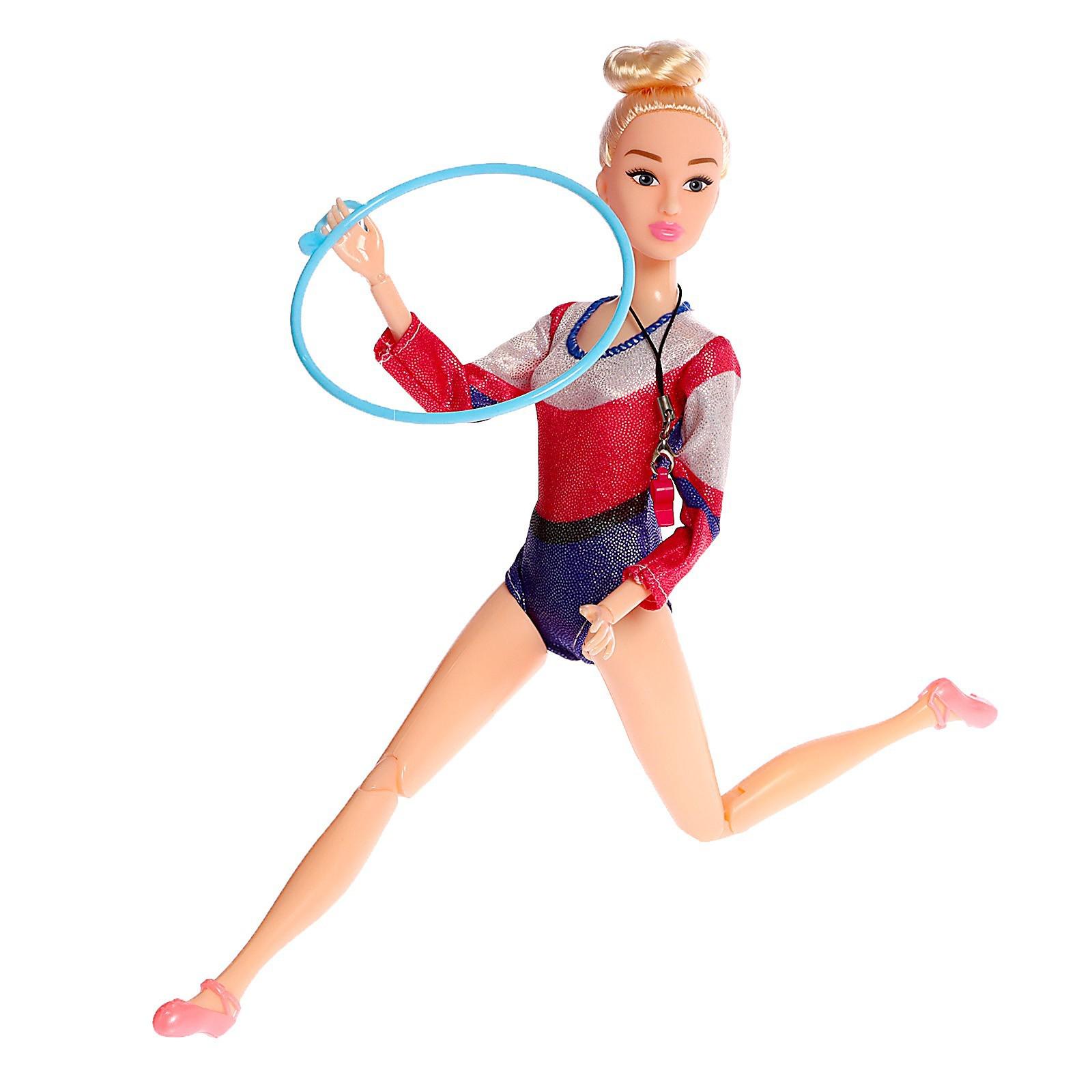 Девочка обожает играть в куклы и придумывать с ними разные истории? Порадуйте её красавицей-гимнасткой! В комплект с куклой входят 2 обруча и свисток.