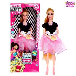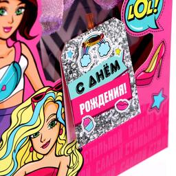 Поздравительный набор станет любимым подарком вашей модницы! В комплекте есть куколка и открытка. Волосы на затылке не прошиты, в локтях кукла шарнирная, в коленях — нет. Размер: 7,5 × 3 × 29 см. У куклы длинные волосы, на которых можно тренироваться в создании причёсок.