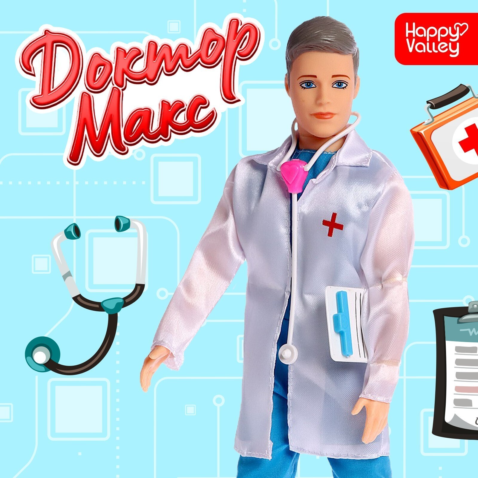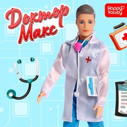 С игровым набор «Доктор Макс» ребёнок воссоздаст обстановку в больнице и сможет представить себя доктором или пациентом. Кукла одета в медицинскую форму. В комплекте есть фонендоскоп и планшет для записи рецептов.