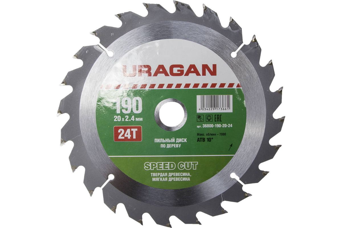 Круг пильный твердосплавный URAGAN 36800-190-20-24 быстрый рез по дереву 190х20мм 24т