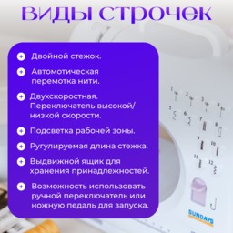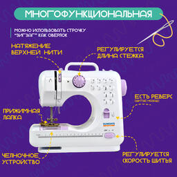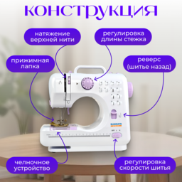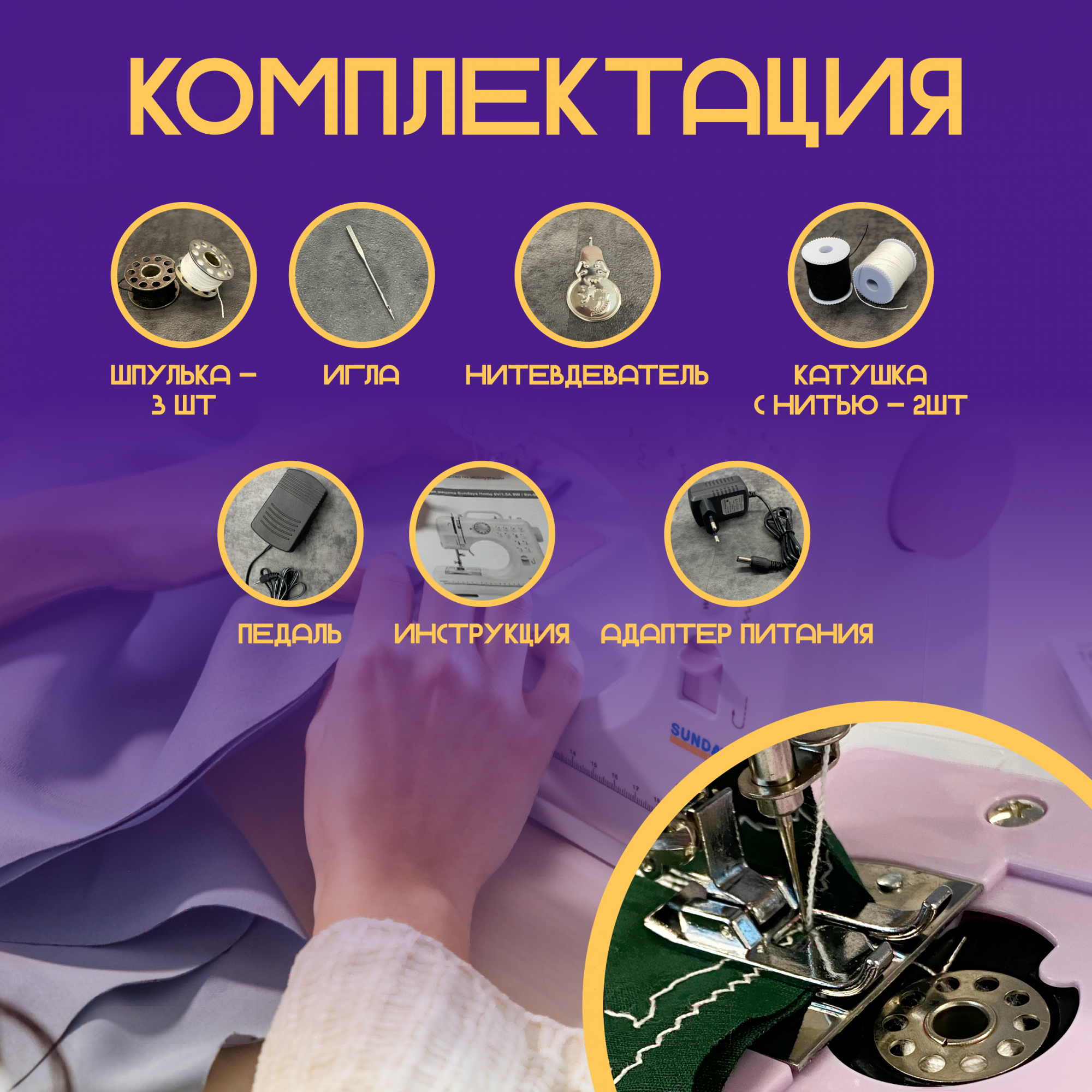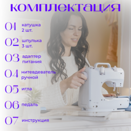 • Дополнительная комплектация шпулька (3 шт.), педаль, нитевдеватель ручной, инструкция, игла, катушка (2 шт.), адаптер питания