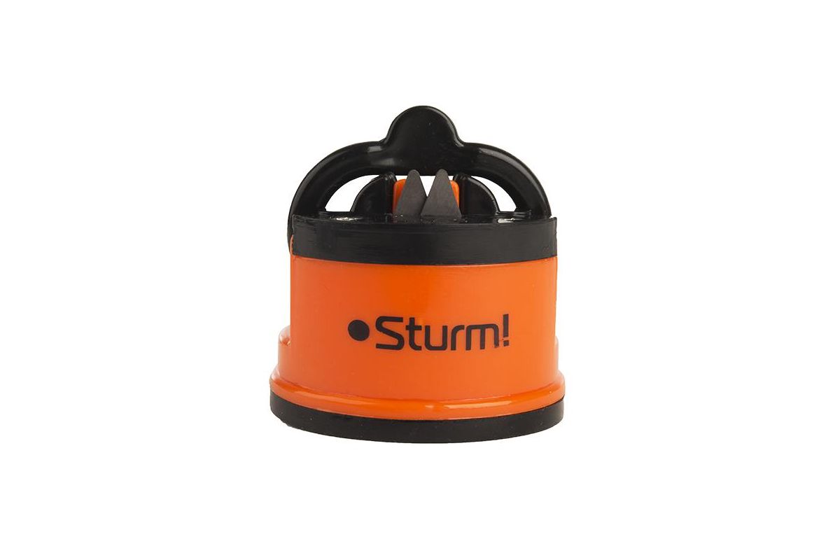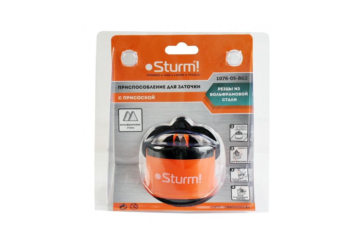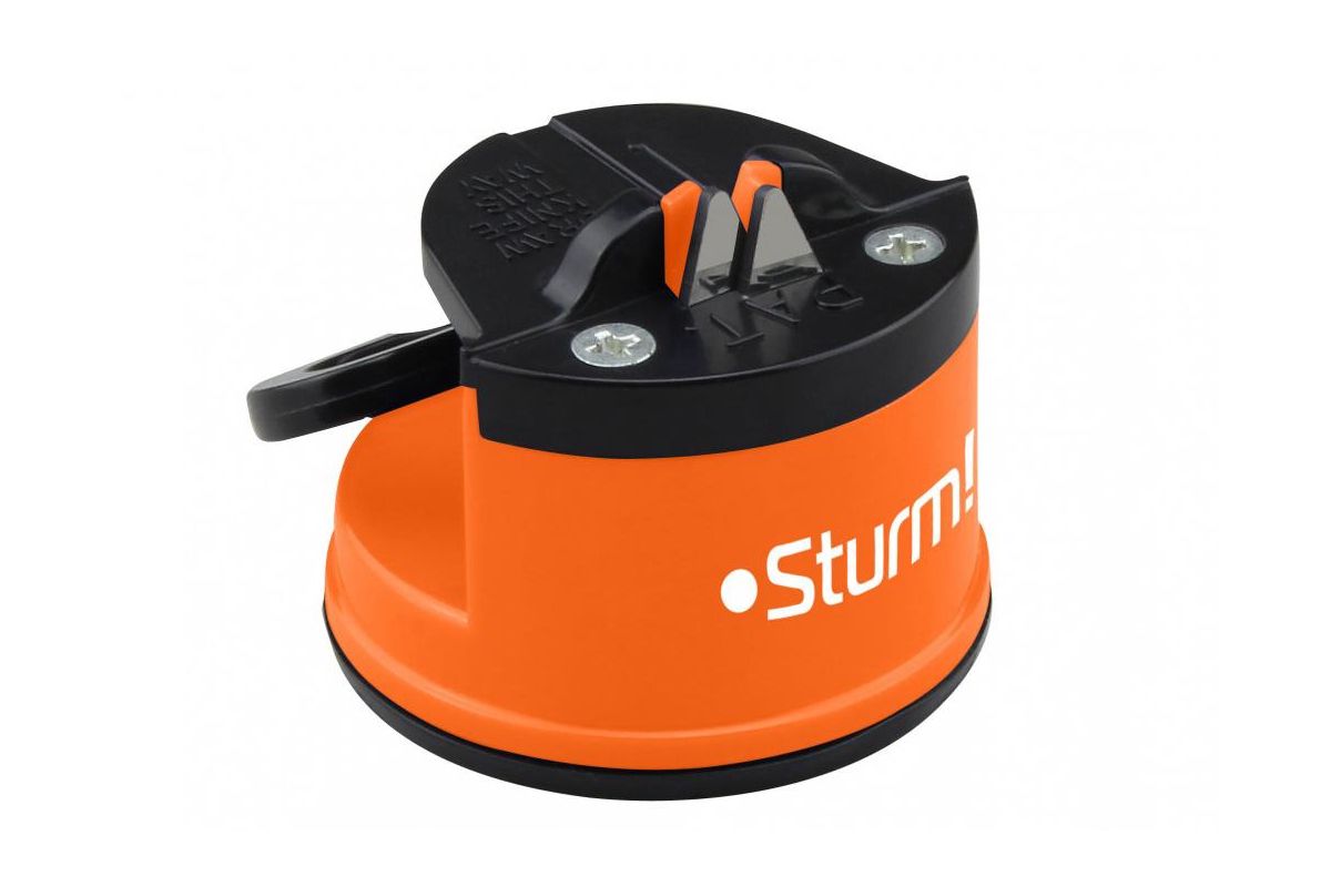 Устройство для заточки ножей STURM! 1076-05-BG2 на липучке (присоске). Точилку можно устанавливать на гладкую поверхность. Изготовлено из вольфрамовой стали и пластика.