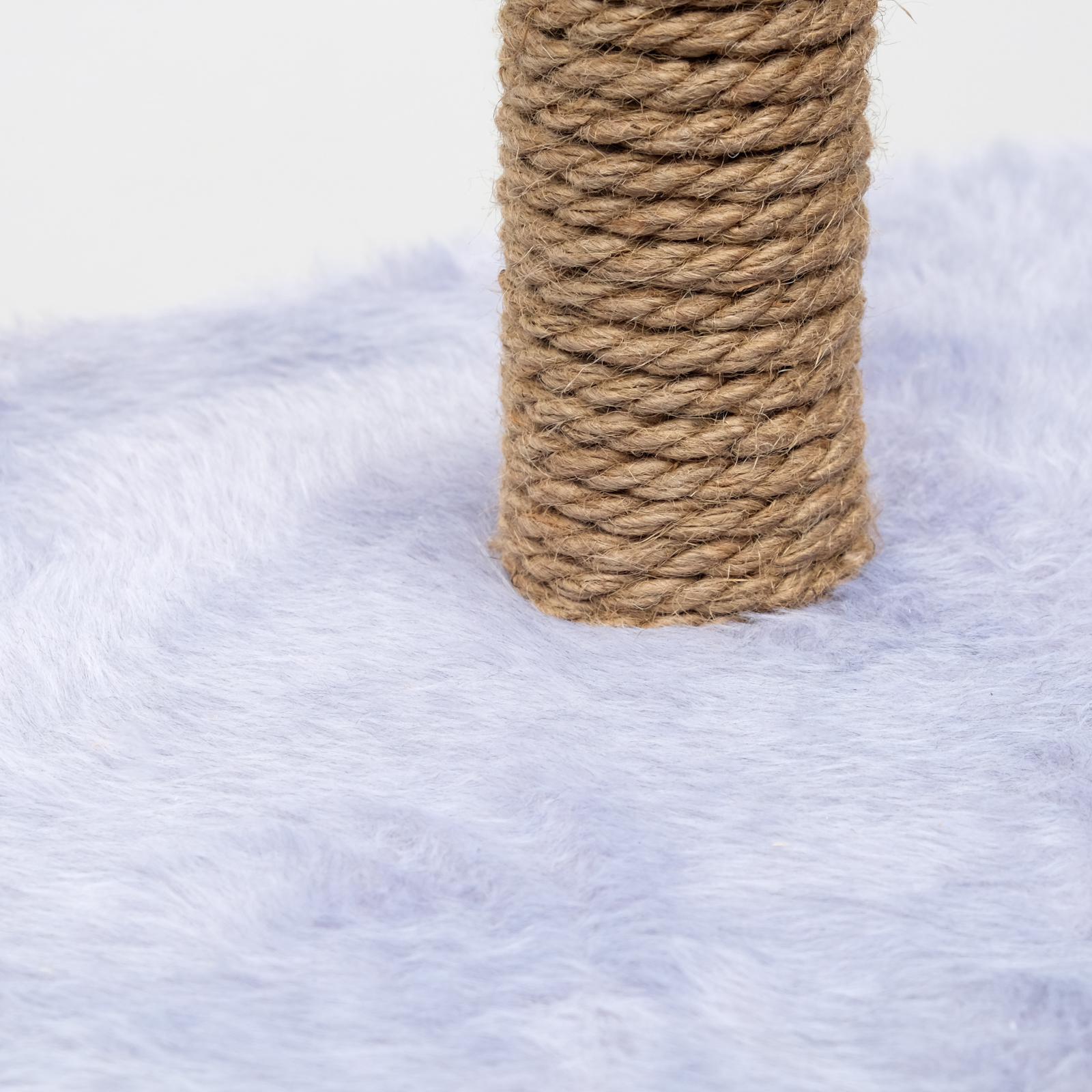 Внизу закрытый круглый домик для отдыха. Внутри съемный матрасик, который можно часто стирать. Над домиком расположена жесткая платформа с мягкой обивкой.