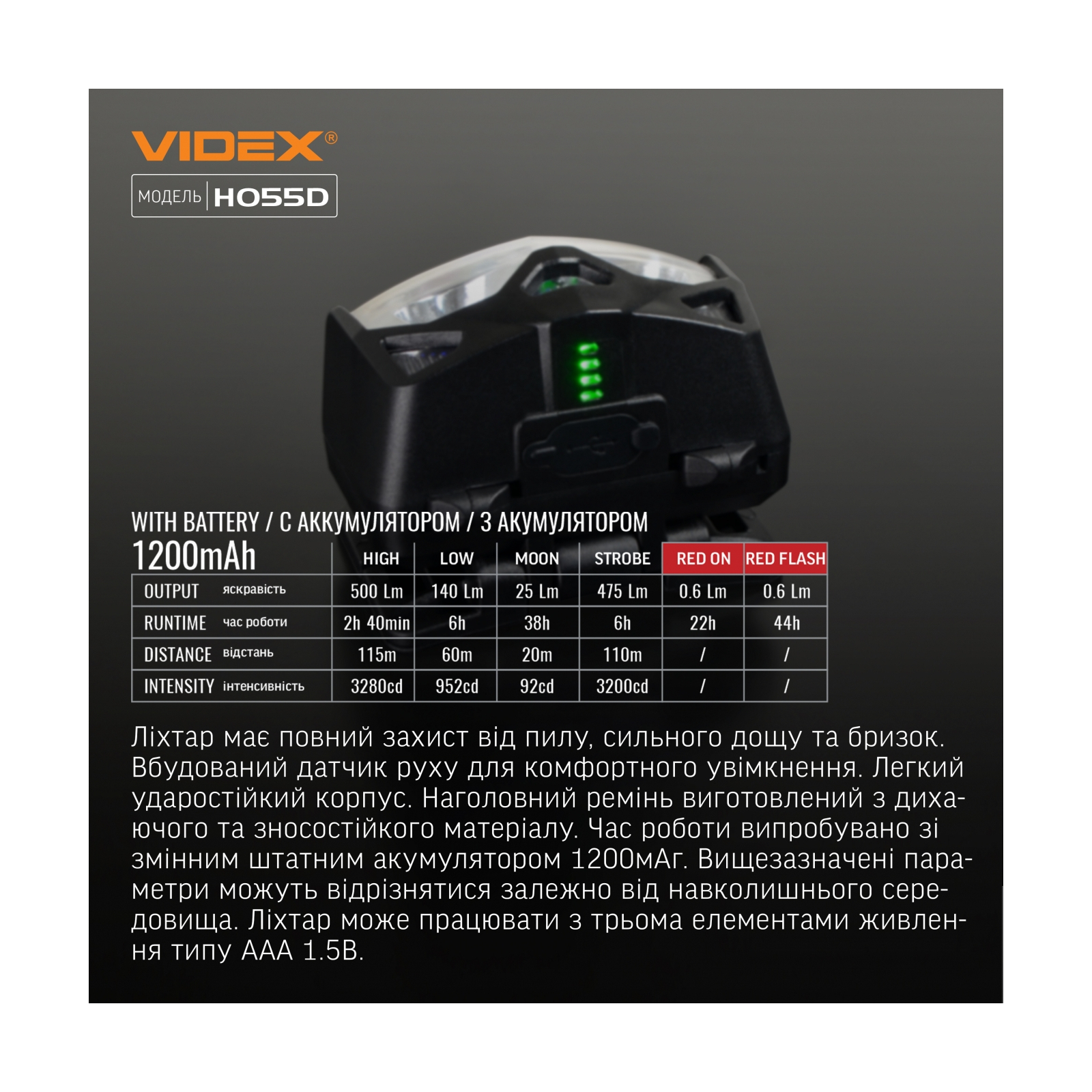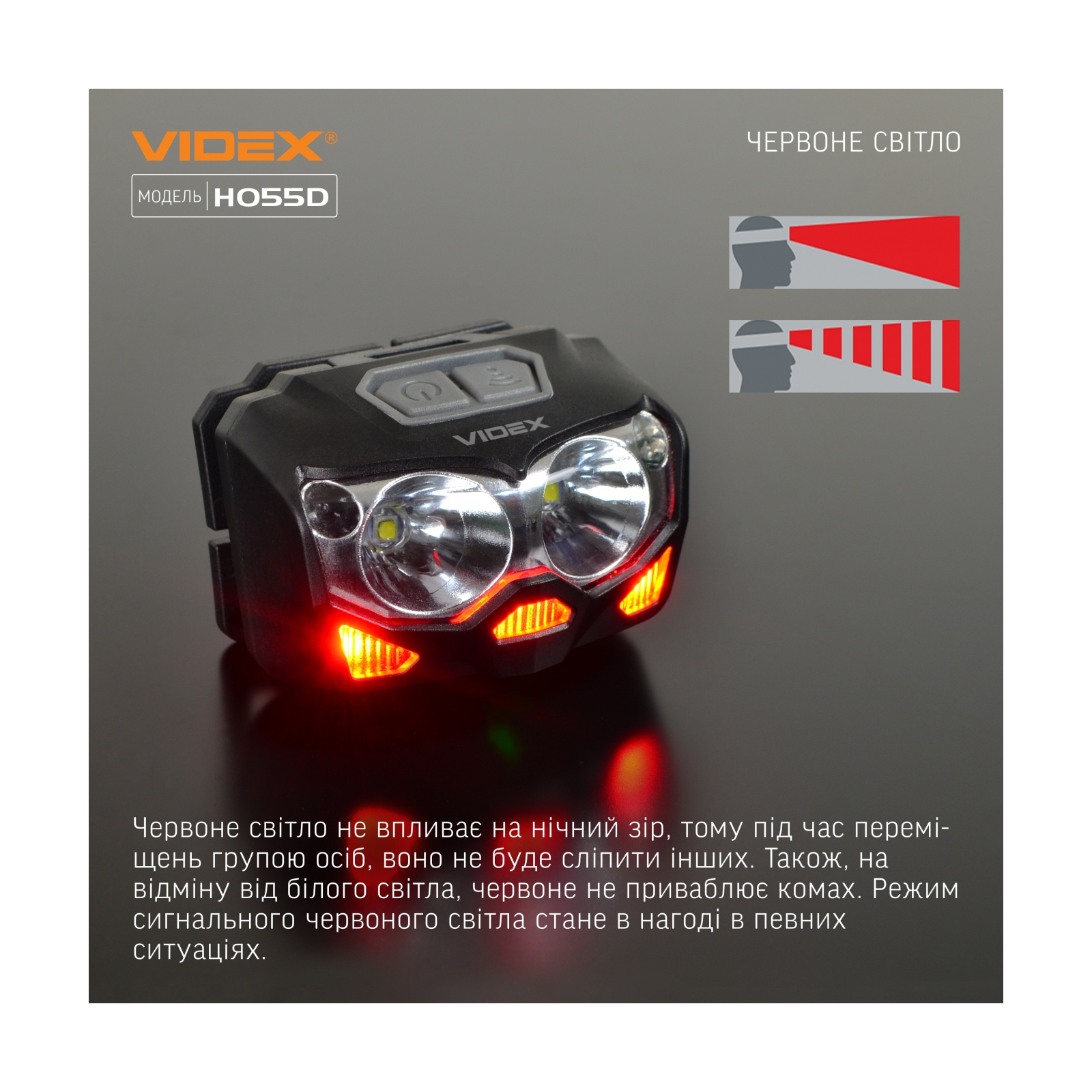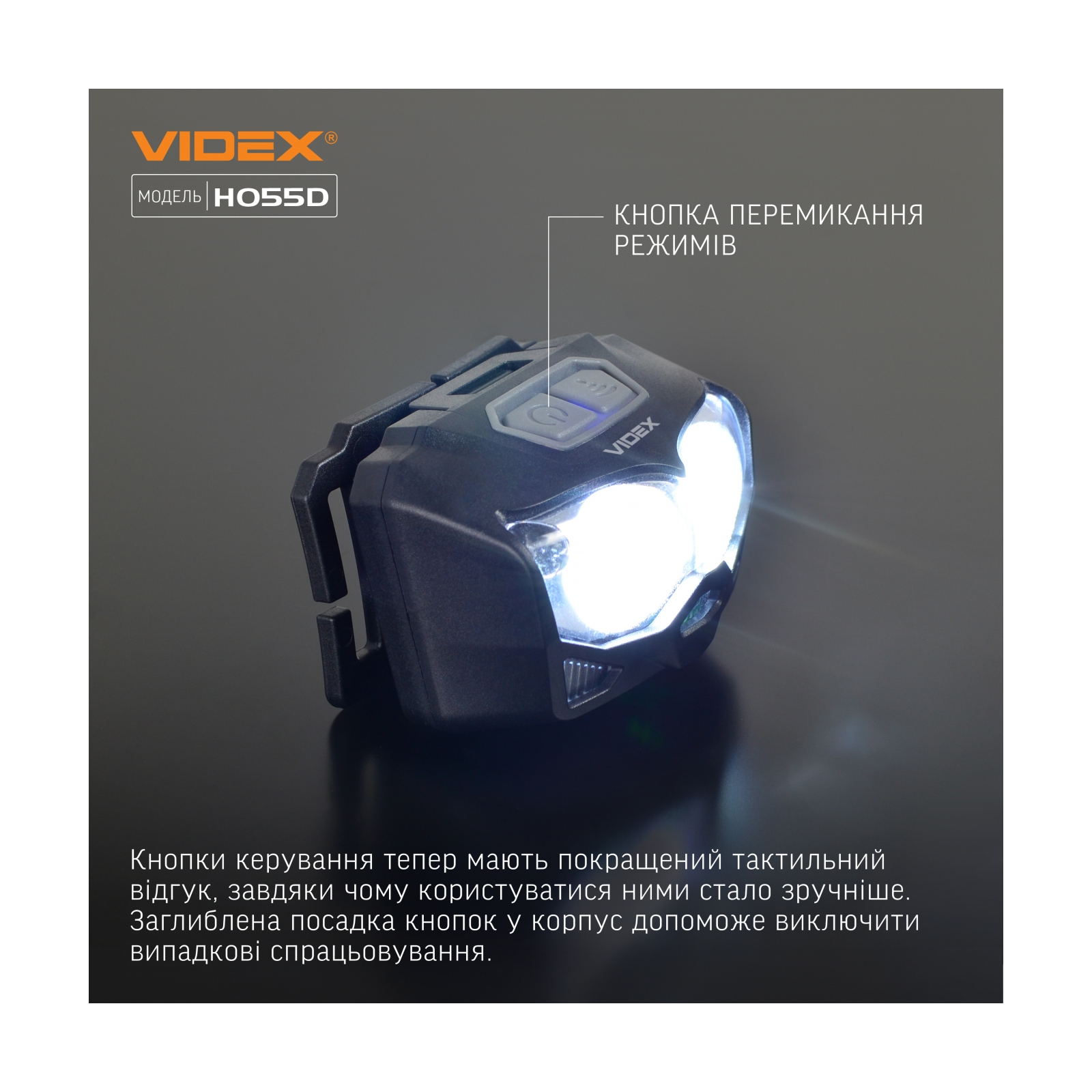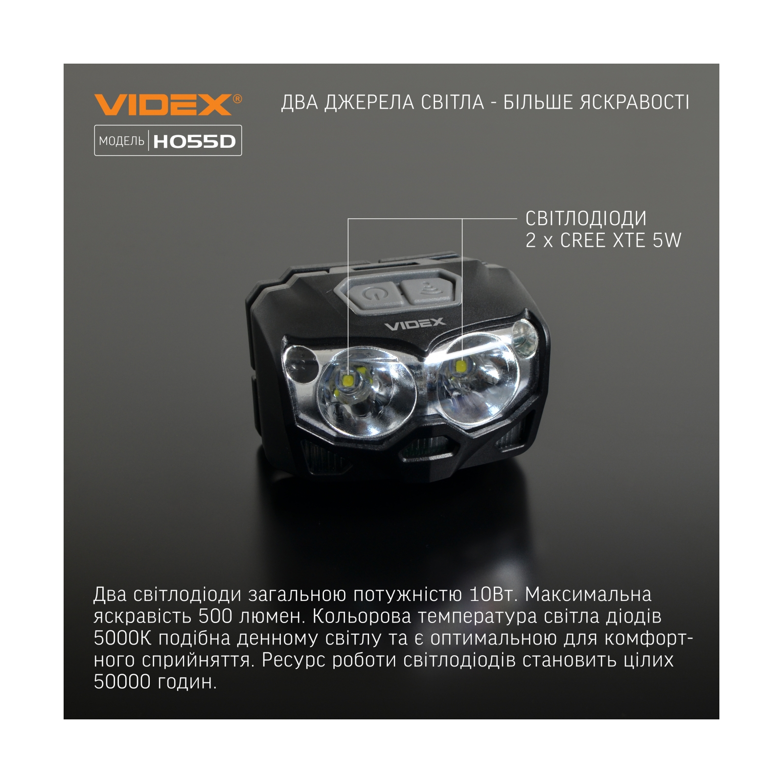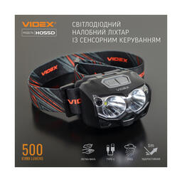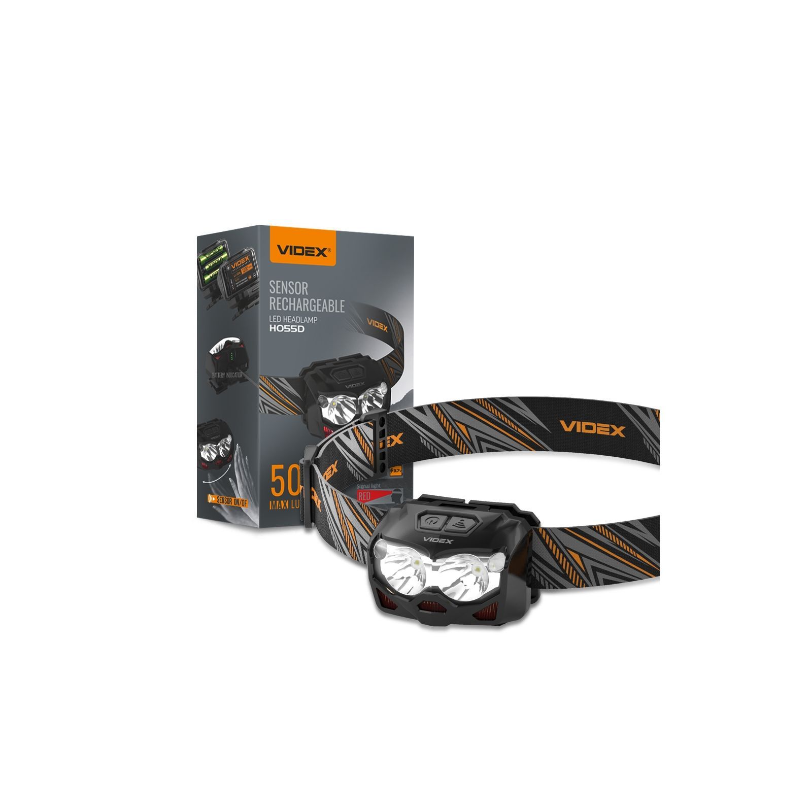 Налобний світлодіодний ліхтарик VIDEX VLF-H055D 5000K призначений для індивідуального використання у темний час доби або у приміщеннях без освітлення. розроблений спеціально для активного відпочинку, кемпінгу та для занять такими видами спорту, як біг, трейловий біг, походи. Легка конструкція корпусу запобігає трясці під час бігу і не створює дискомфорту при тривалому носінні. Максимальна яскравість – 500 Lm. Регульований кут нахилу кріплення дозволяє вибрати зручний кут освітлення. Використовується налобний ремінь для ліхтаря із зносостійкого матеріалу, м'якого за текстурою, що забезпечує зручне користування. Кнопка сенсора допомагає увімкнути ліхтар та контролювати його режими жестами рук. Тривале натискання кнопки сенсора відображає заряд ліхтаря. Короткочасне натискання функціональної кнопки дозволяє перемикати режими роботи.