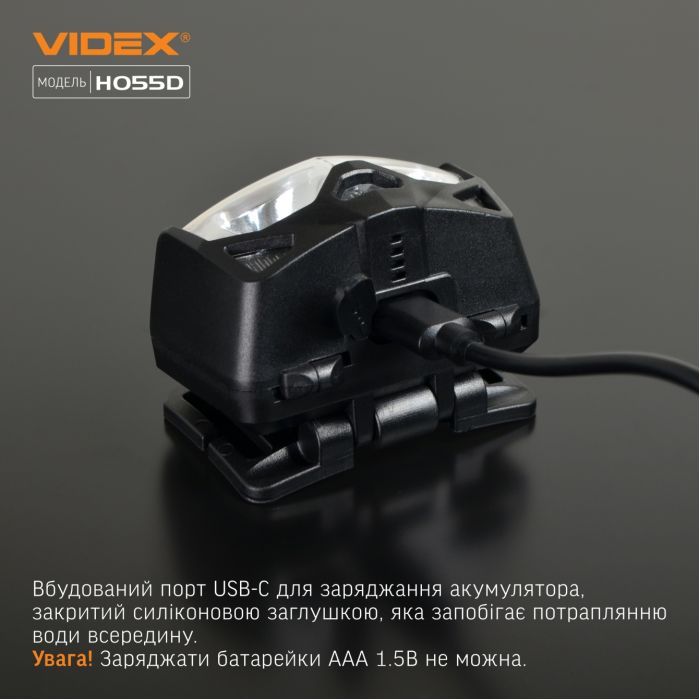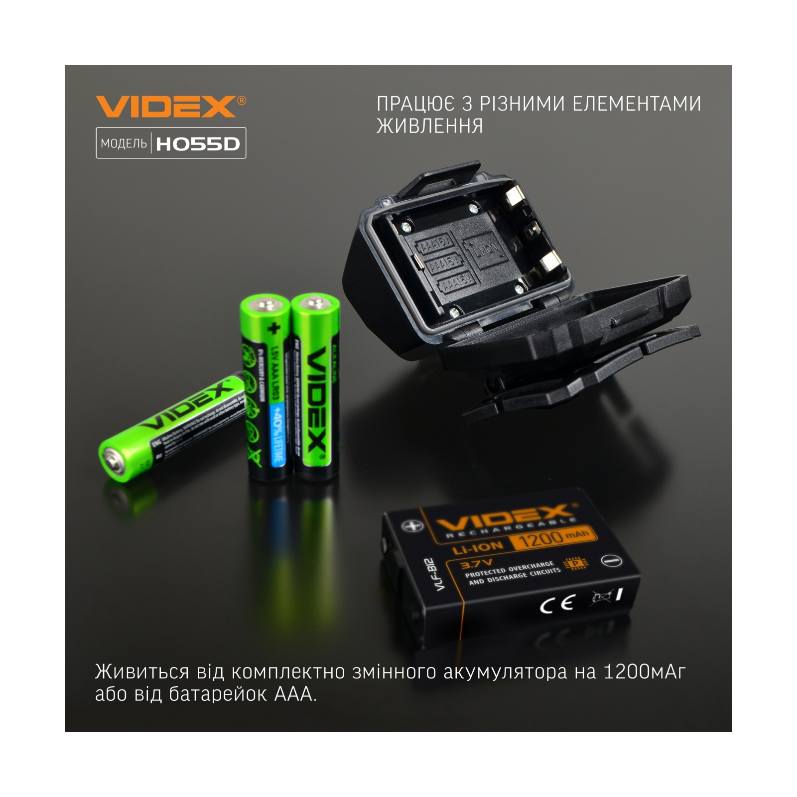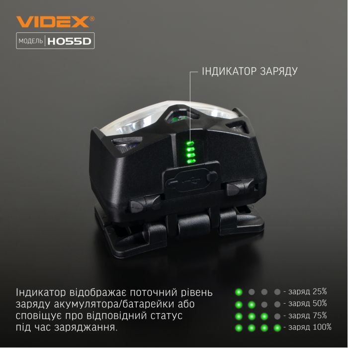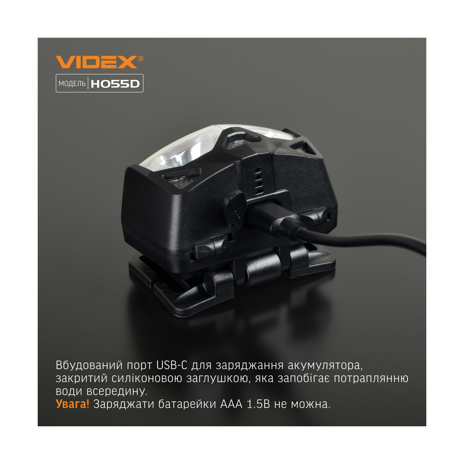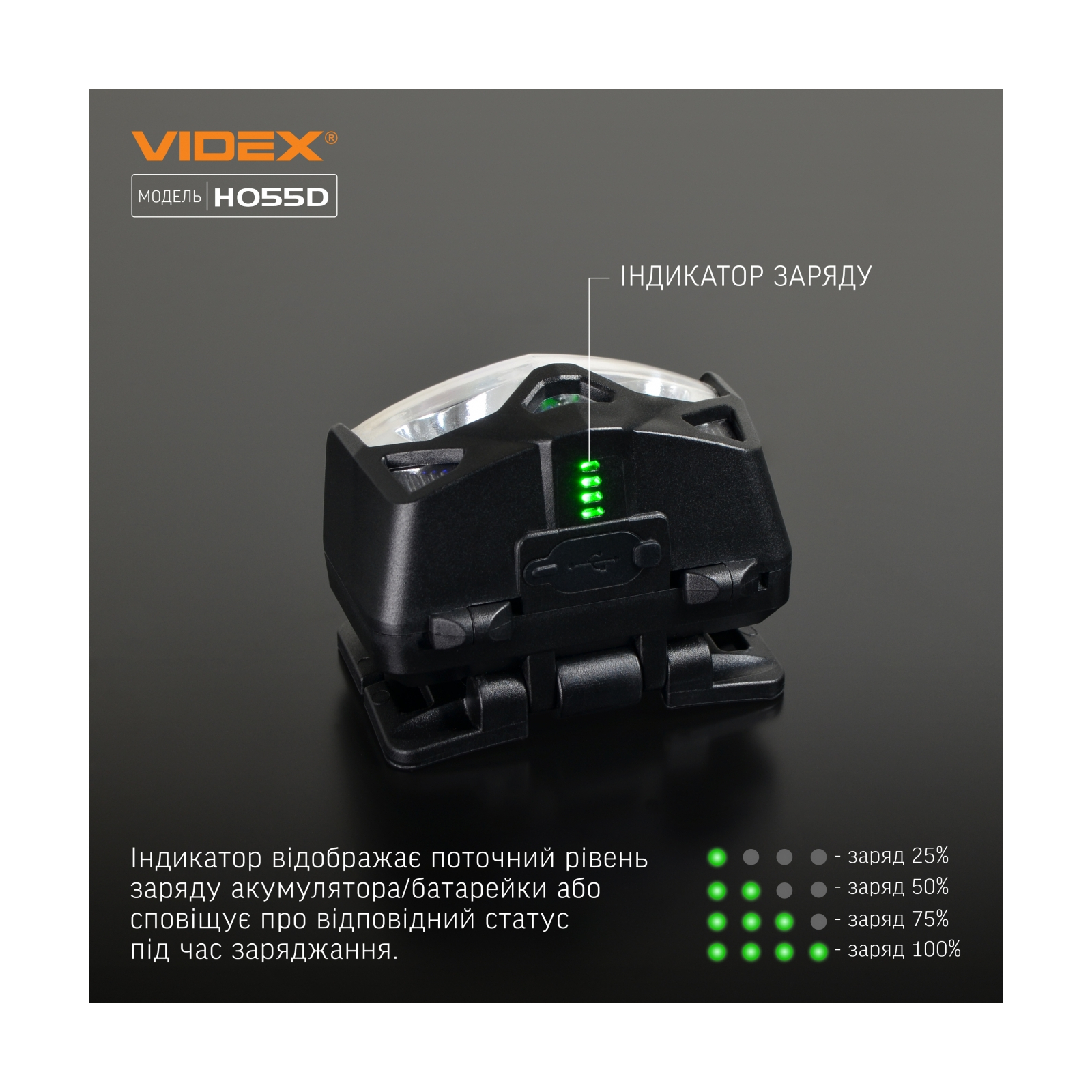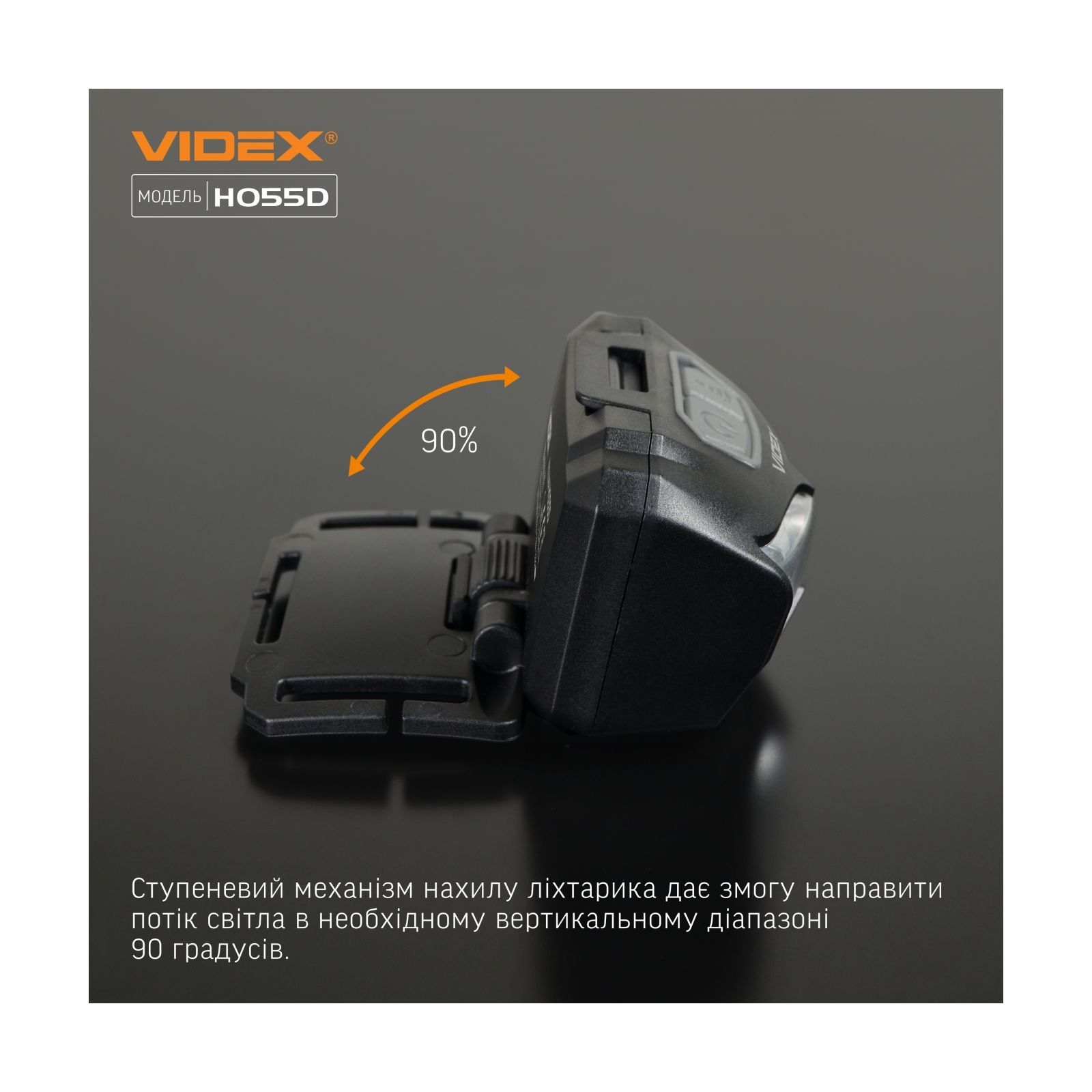 Налобний світлодіодний ліхтарик VIDEX VLF-H055D 5000K призначений для індивідуального використання у темний час доби або у приміщеннях без освітлення. розроблений спеціально для активного відпочинку, кемпінгу та для занять такими видами спорту, як біг, трейловий біг, походи. Легка конструкція корпусу запобігає трясці під час бігу і не створює дискомфорту при тривалому носінні. Максимальна яскравість – 500 Lm. Регульований кут нахилу кріплення дозволяє вибрати зручний кут освітлення. Використовується налобний ремінь для ліхтаря із зносостійкого матеріалу, м'якого за текстурою, що забезпечує зручне користування. Кнопка сенсора допомагає увімкнути ліхтар та контролювати його режими жестами рук. Тривале натискання кнопки сенсора відображає заряд ліхтаря. Короткочасне натискання функціональної кнопки дозволяє перемикати режими роботи.