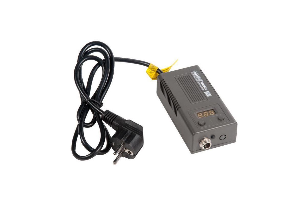 Малогабаритная паяльная станция портативна с цифровым управлением и антистатическим исполнением (ESD). Наконечник (тип Hakko T12) представляет собой картридж, где нагревательный элемент, термосенсор и жало паяльника составляют единое целое.