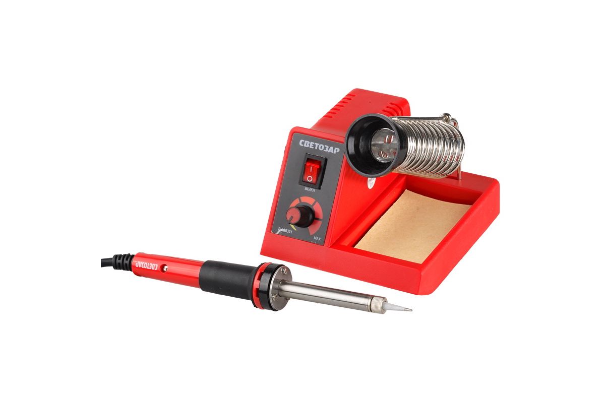СВЕТОЗАР SV-55331 – аналоговая паяльная станция для контактной пайки. Модель работает от электросети. Мощность инструмента – 48 Вт. Паяльная станция предназначена для точного паяния различных инструментов при температуре от 100 до 450 °C. Для удобства оператора станция оснащена регулятором температуры. Вес модели – 0,3 кг.