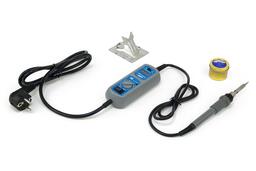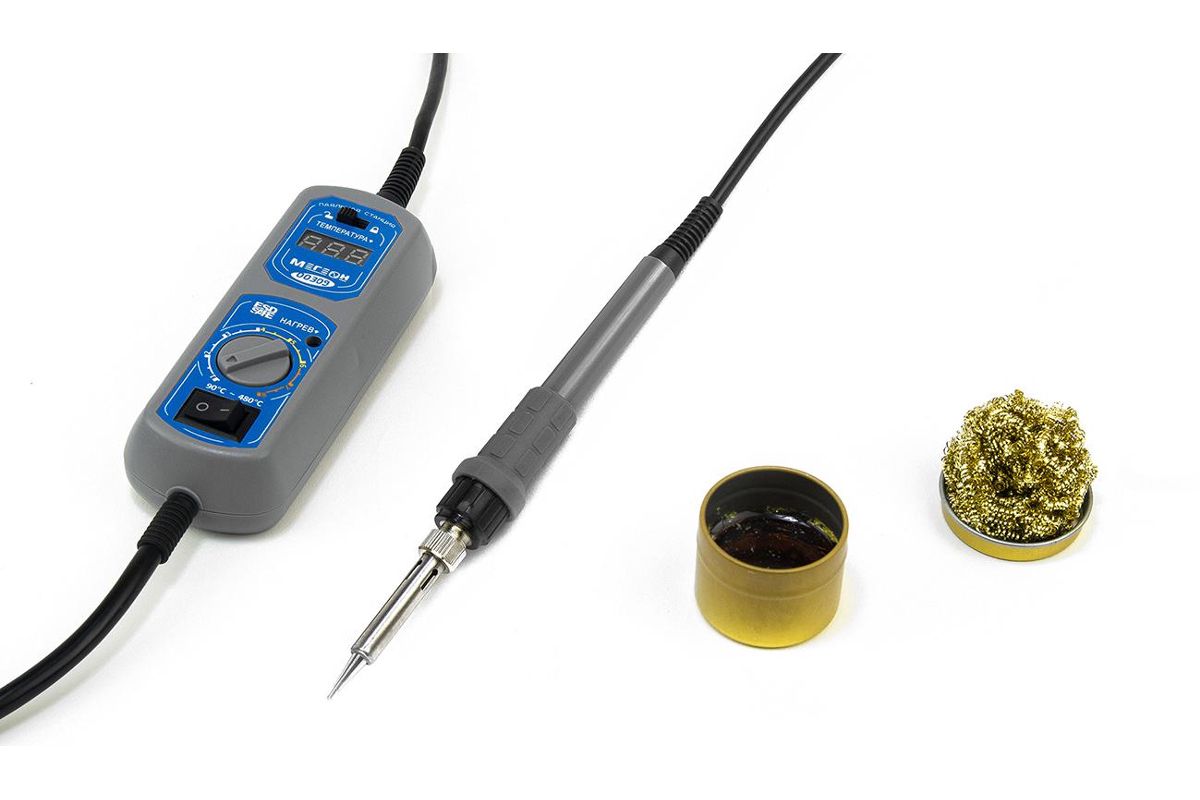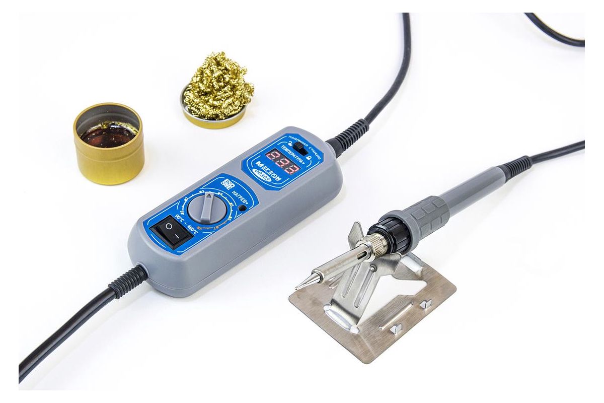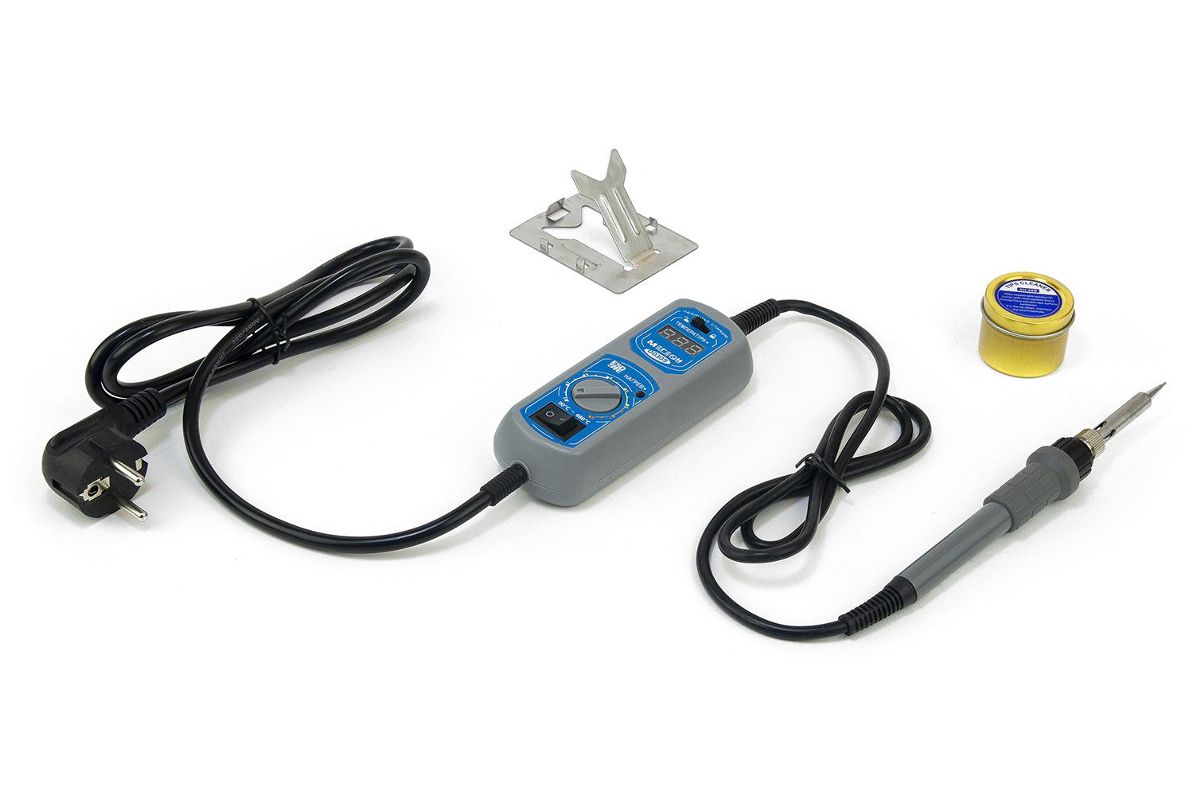 МЕГЕОН – 00309 - это удобный паяльник с цифровым управлением температурой. Немаловажным преимуществом при работе с паяльником является маленький вес и быстрый нагрев, точное поддержание температуры. Большое количество сменных наконечников разной формы (в комплект не входят). Яркий светодиодный дисплей и удобный регулятор для установки. В комплекте удобная металлическая баночка с канифолью и очистителем наконечника.