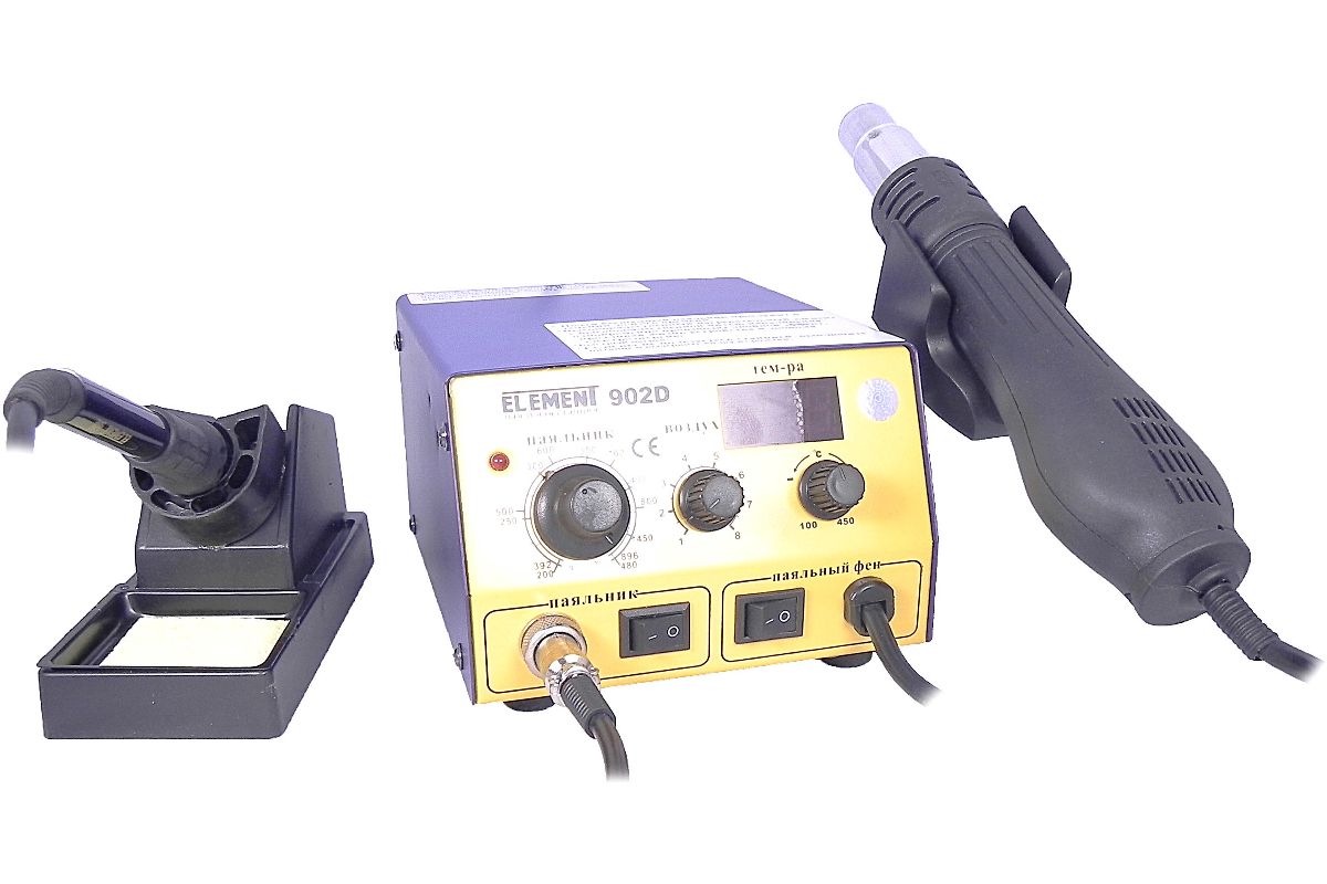 Паяльная станция ELEMENT 902D - двухканальное оборудование с цифровой индикацией температуры, которое состоит из блока питания, паяльника и фена с насадками.
