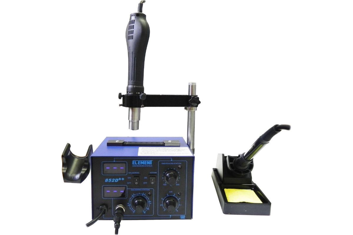 Паяльная станция с держателем фена ELEMENT 852D++ - это двухканальная паяльная станция с цифровой индикацией температуры, которая предназначена для монтажа/демонтажа различных компонентов при ремонте радиотехники.