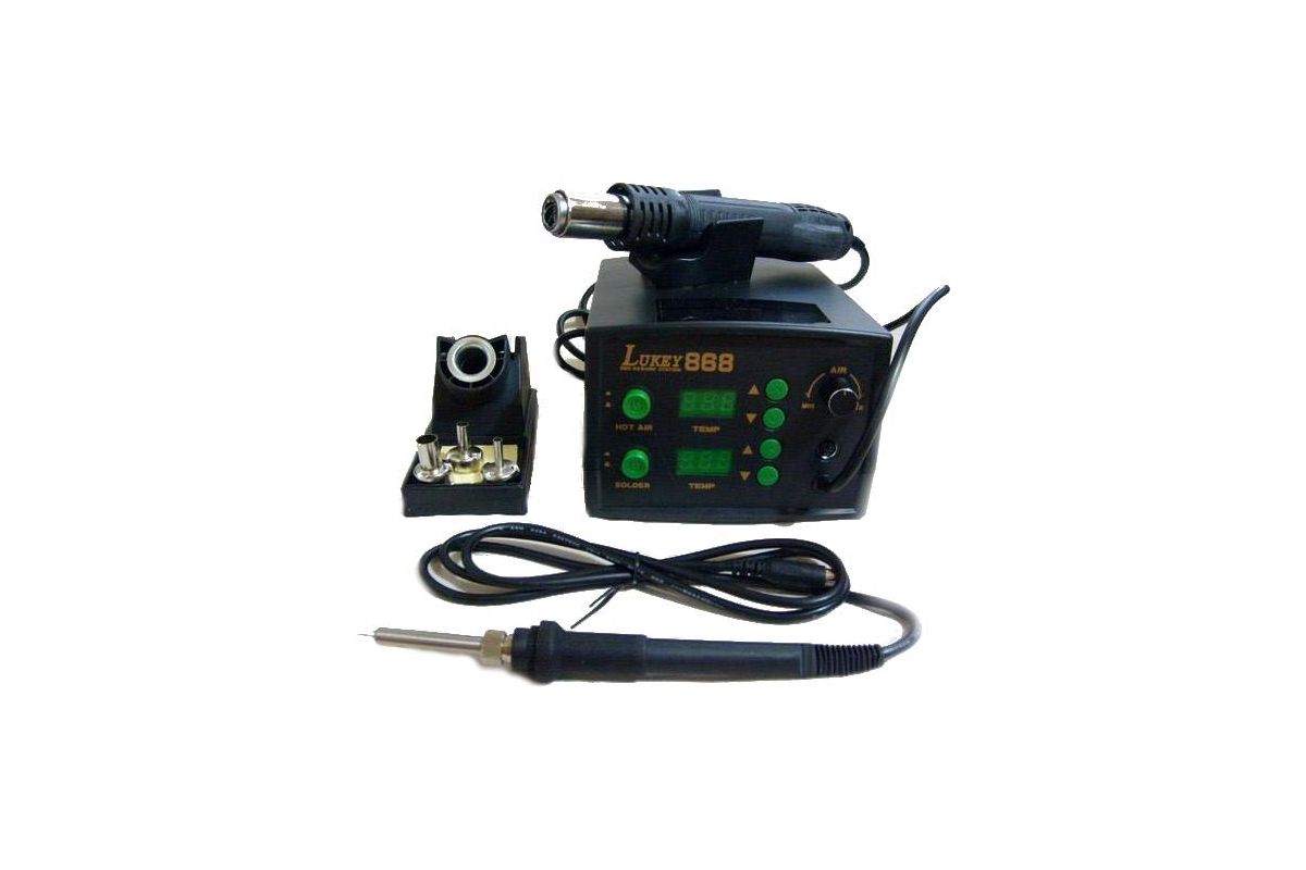 Турбинная комбинированная двухканальная паяльная станция LUKEY 868 используется для работы с PLCC, SOP, SMD, QFP, SOIC, BGA, CHIP компонентами. Данная термовоздушная монтажно-демонтажная система с цифровой индикацией фактической температуры потока горячего воздуха отличается минимальной погрешностью при работе с различными материалами. Нагревательный элемент паяльника - Hakko.