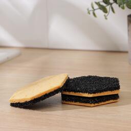 Губка для тефлоновой посуды изготовлена из специального материала и имеет два слоя. Первый — это поролон с антибактериальным покрытием, не оставляющим без следов и повреждений. Второй — абразивный, который представляет собой микрофибру. Именно он создаёт много пены для быстрого и качественного удаления грязи.