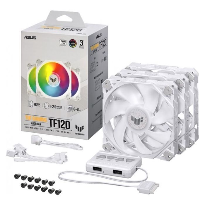 TUF Gaming TF120 ARGB — корпусні вентилятори від компанії Asus для високої продуктивності системи й тривалої експлуатації. Вентилятори розміром 120 мм забезпечують ідеальний баланс між повітряним потоком і статичним тиском. У комплект входять три вентилятори та контролер ARGB для добору потрібної підсвітки вашої системи.