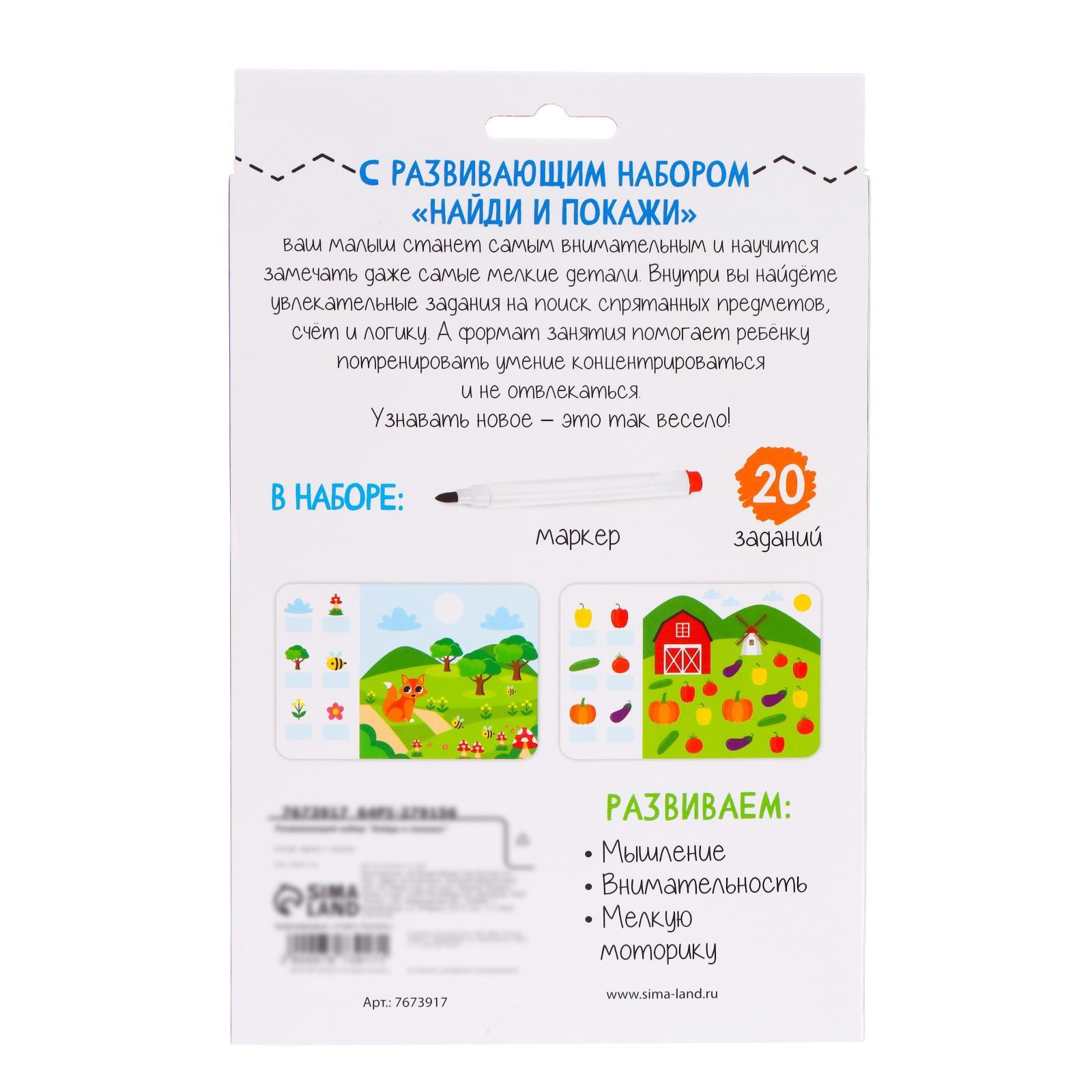 С развивающим набором «Найди и покажи» малыш потренирует внимание и выполнит интересные задания. Внутри вы найдёте 20 заданий и 1 маркер.
