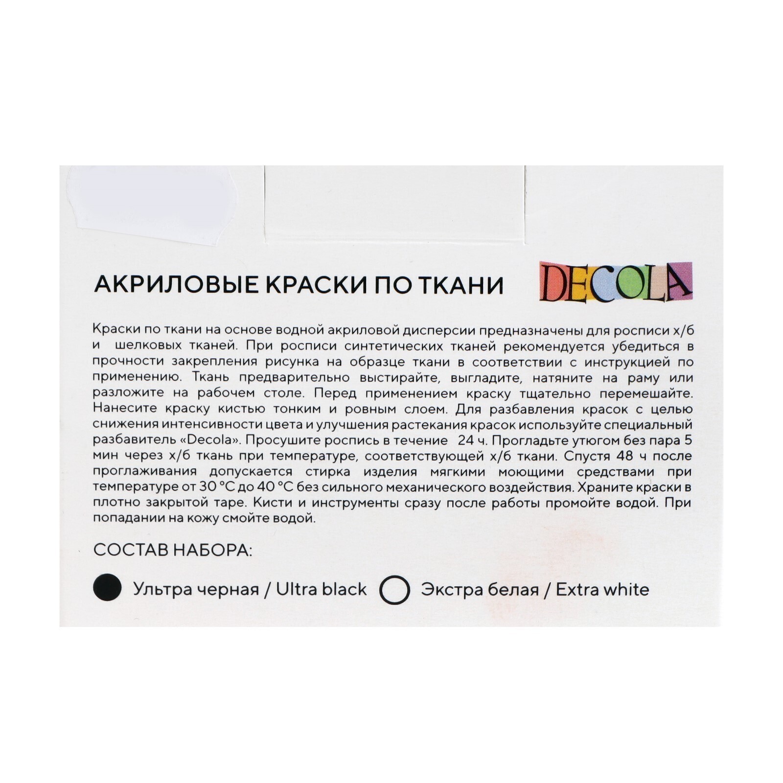 Акриловые краски по ткани "Decola" изготавливаются на основе водной акриловой дисперсии и образуют после высыхания прочную эластичную пленку на поверхности.