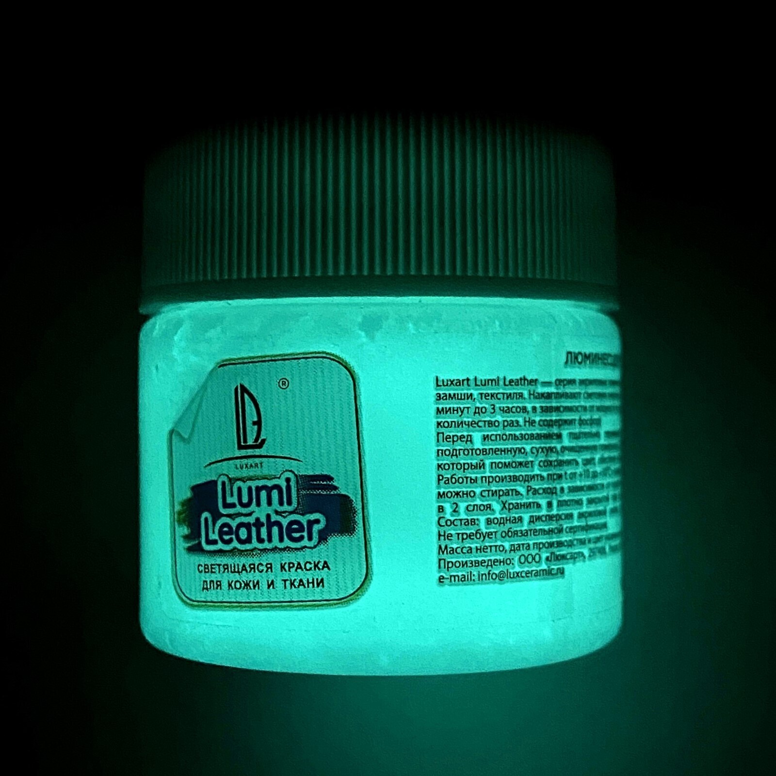 Универсальная краска-краситель на водной основе Luxart Leather Lumi , для всех видов гладкой кожи, замши, нубука, текстиля. Применяется для восстановления или декорирования кожаных/тканевых изделий . Глубоко проникает в структуру кожи и ткани, может быть использована в качестве грунта перед покраской. Все цвета смешиваются между собой для получения других цветов или оттенков. Чтобы получить нужный цвет используйте базовые цвета серии Luxart Leather и Luxart Leather Base. Cветонакопительные краски светятся в темноте без использования дополнительных УФ-излучателей. Обладают свойством накапливания световой энергии от солнца и электрических ламп, а в темном помещении излучают её (светятся). Цикл “накопление-свечение” можно повторять неограниченное количество раз. После накопления энергии краски и окрашенные ими изделия светятся в темноте от 30 минут до 3 часов, в зависимости от мощности полученного заряда. Краски серии Luxart Leather Lumi НЕ СОДЕРЖАТ ФОСФОР!