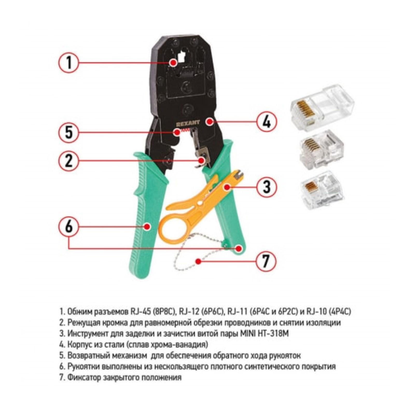 Кримпер REXANT HT-200, для обжима 8P8C, 6P6C, 4P4C, заделка витой пары, возвратный механизм