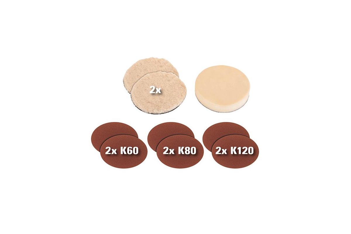 В комплекте 6 шлифдиска, 2 войлочных и пенопластовый диска, кейс