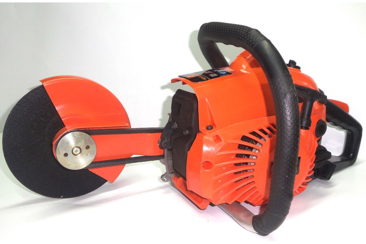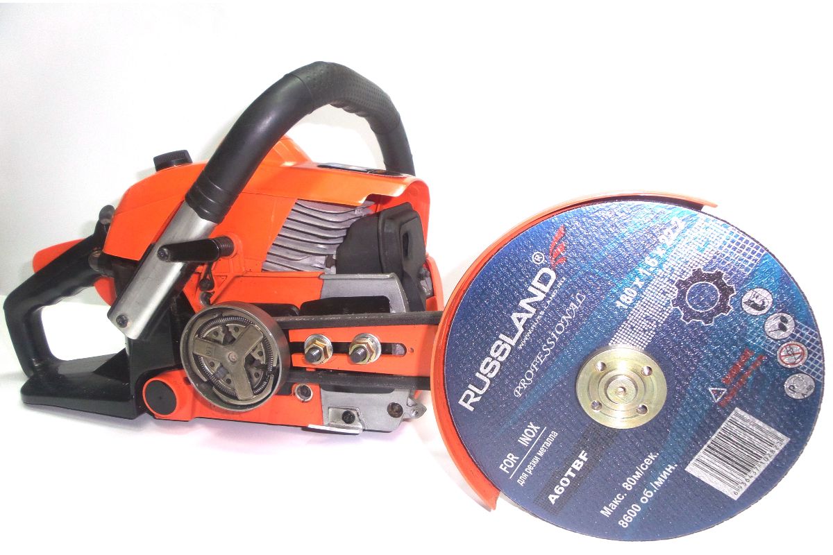 Вращение отрезного круга обеспечивает клиноременной передачей. Передаточное отношение снижено 2:3, что позволяет работать бензопилой полный газ. Шпиндель установлен на двух радиальных шариковых подшипниках. Круг крепится к шпинделю с помощью планшайбы (имеющей паз для предотвращения проворота) и гайки с левой резьбой, устанавливается вместо снятой шины. Комплектуется в зависимости от марки пилы и длинномера режущего инструмента (150мм, 180мм, 230мм)