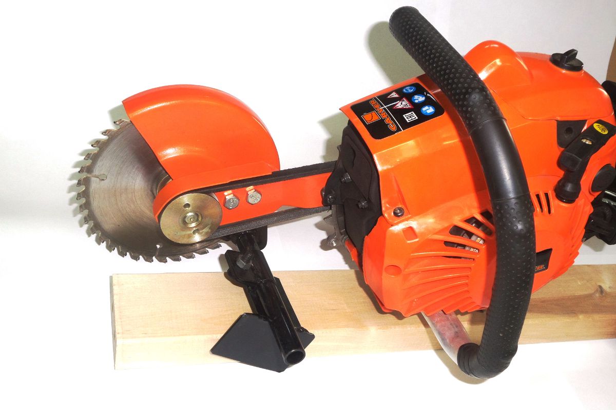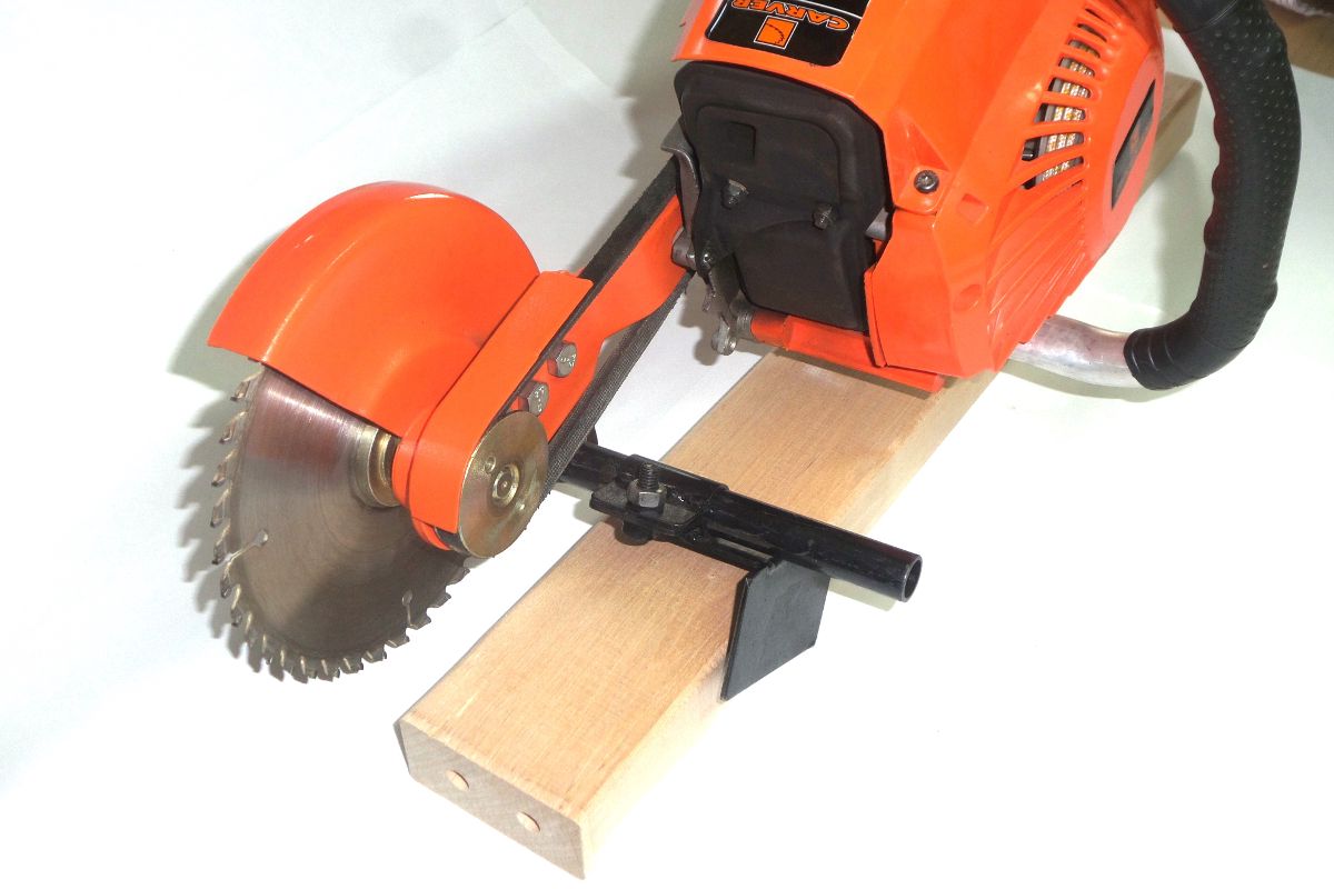 С помощью дополнительного приспособления болгарка превращается в циркулярку. Появляется возможность мерного раскроя материалов таких как древесина на бруски (с установленным пильным диском по дереву), металл на полосы (с установленным отрезным кругом), камня, кирпича (с установленным алмазным отрезным кругом) и.т.д. Ширина реза варьируется от 10мм до 200мм.
