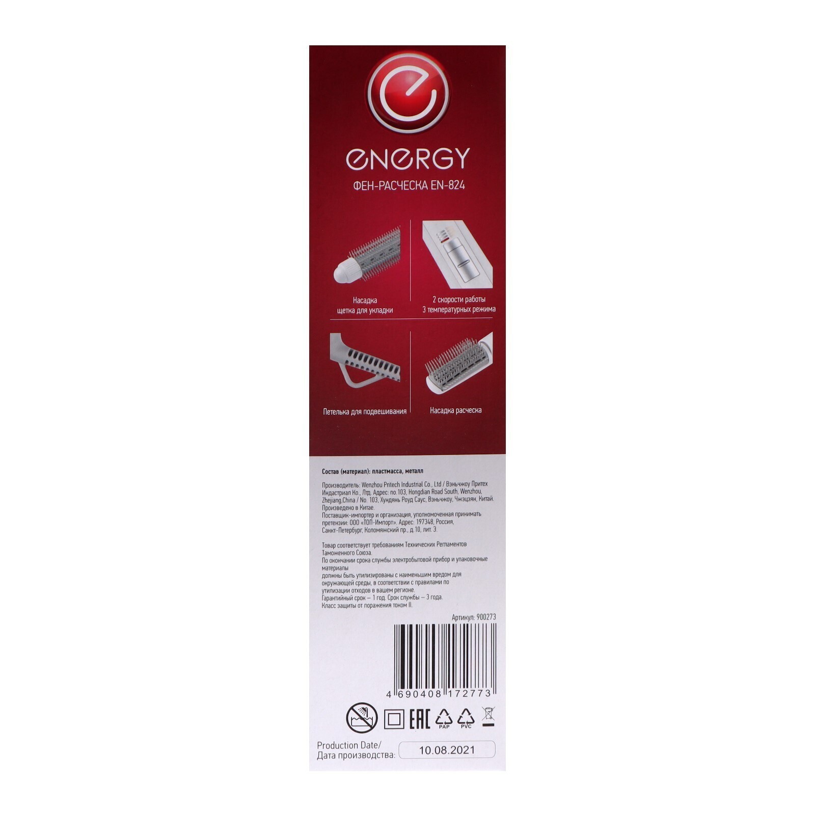Фен-щетка ENERGY EN-824, 550 Вт, 3 режима, 2 насадки, белая