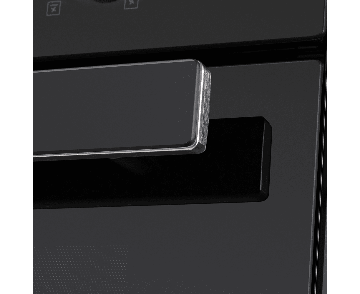 Фронтальная панель дверцы, лицевая часть блока управления и фасад ручки дверцы сделаны из высококачественного жаропрочного стекла черного цвета, окрашенного по всему объему, что является отличительной чертой бытового прибора премиум-класса.