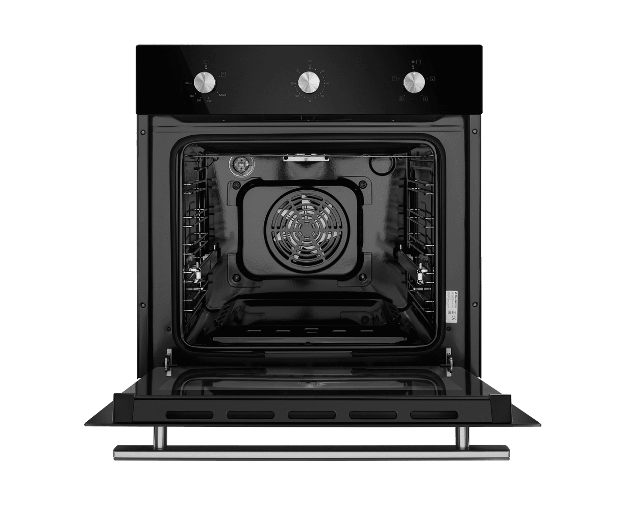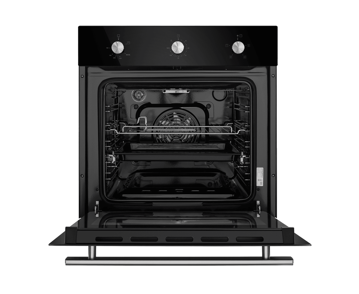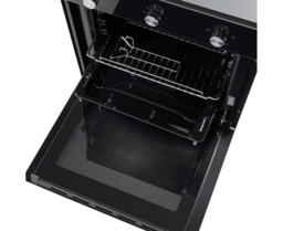 Механическое управление осуществляется цельнометаллическими поворотными ручками. Можно выставить температуру готовки, установить таймер (0-60 мин) и выбрать один из 5 режимов работы: нижний нагрев с вентилятором, конвекция), традиционная готовка, электрический гриль, вентилятор, освещение. Данная модель работает как при открытом, так и при закрытом гриле.