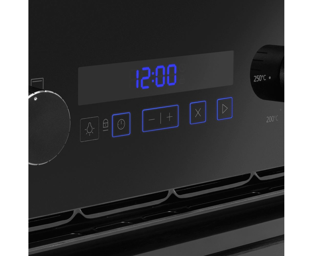 Фронтальная панель дверцы, лицевая часть блока управления и фасад ручки дверцы сделаны из высококачественного жаропрочного стекла черного цвета, окрашенного по всему объему, что является отличительной чертой бытового прибора премиум-класса.