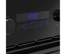 Комбинированное управление реализовано в виде сенсорного управления с подсветкой и поворотных ручек. Можно выбрать режим работы, температуру (160-265℃), установить таймер. В данной модели есть 3 режима работы: нижний нагрев с вентилятором, электрический гриль, освещение. Данная модель работает как при открытом, так и при закрытом гриле.