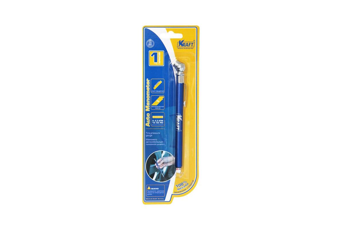 Манометр KRAFT KT 830001 линейный Металлический корпус+металлическая головка. 10-50PSI(3,5 АТМ). Линейная выпадающая шкала.
