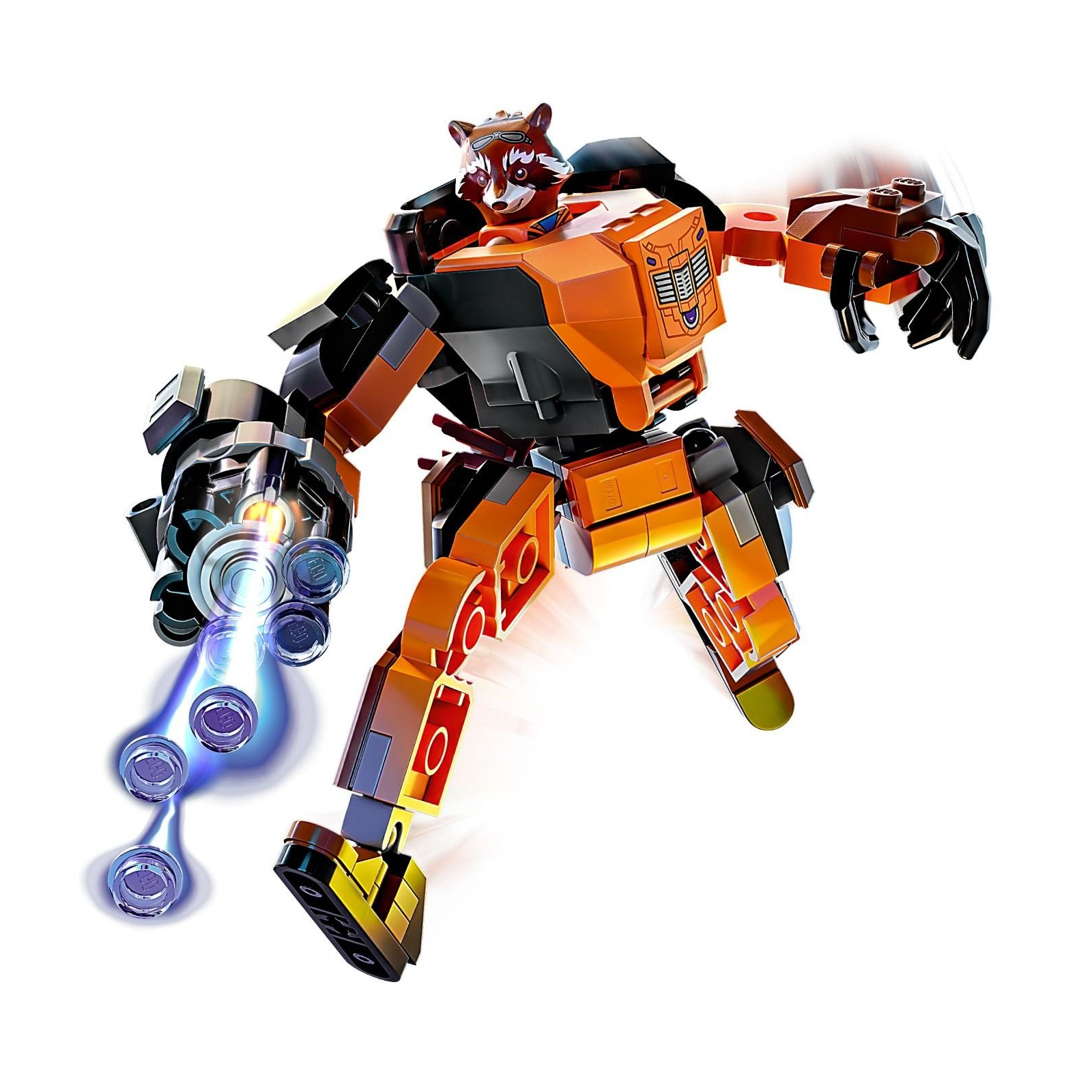 Шанувальникам «Вартових Галактики» студії Marvel обов'язково сподобається конструктор LEGO Marvel Робоброня Єнота Ракети. Велетенська фігура шаленого єнота студії Marvel уміщається в могутній робокабіні. Мініфігурка LEGO Єнота Ракети вміщається в кабіну великогабаритного робота, що відкривається. В одній руці робот тримає величезний бластер, що стріляє з шести установок. Рухливі кінцівки й пальці дозволяють пересувати робота для безмежних можливостей гри та демонстрації. Є також менший бластер, який Ракета може використовувати, коли він не всередині кабіни. Якщо хочете додати цифрових розваг, у додатку LEGO Builder є функція інтуїтивного масштабування й обертання, що дозволяє дітям, складаючи моделі, візуалізувати їх.