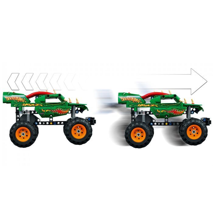 Гадаєте, впораєтеся з жаром Monster Jam? Час випробування ваших навичок за допомогою набору LEGO Technic Monster Jam Dragon. Зберіть вантажівку з лютими драконячими шипами, рогами й вогняними деталями. Потім потягніть назад двигун, щоб прискорити його — або виконайте круті трюки, як справжній учасник змагань! Коли настане час для чогось нового, перетворіть вантажівку на Багі «Крокодил».