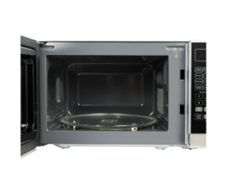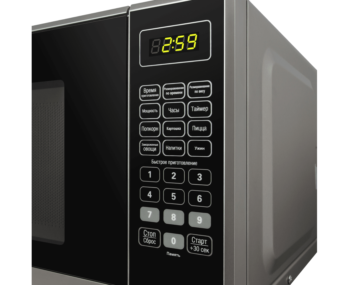Дверца черного цвета из двойного закаленного стекла открывается за ручку. В микроволновке предусмотрена функция автостоп, позволяющая открывать дверцу в любой момент готовки.