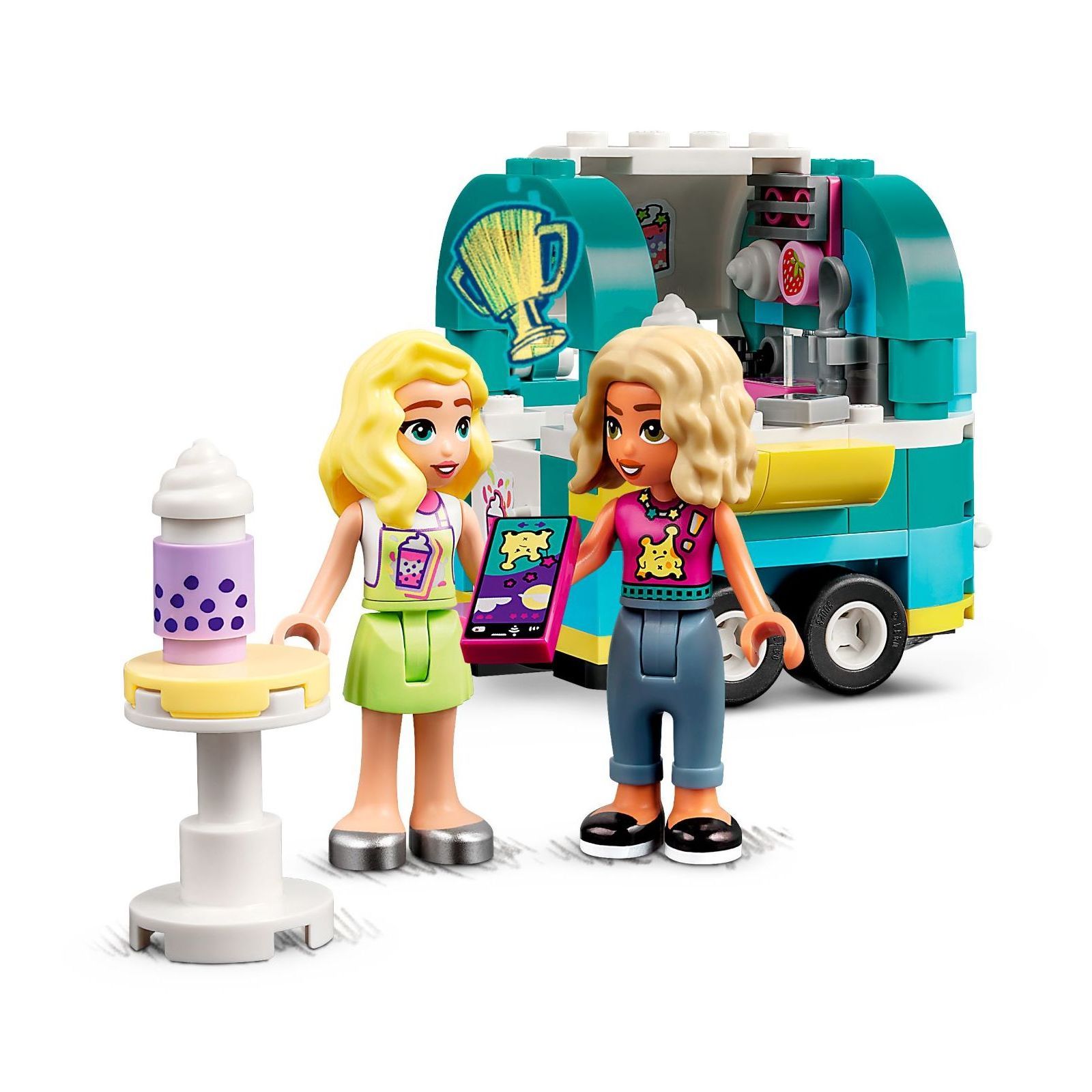 Творчі діти можуть грати з цим конструктором LEGO Friends Бабл ті кафе на колесах. Візок для бульбашкового чаю приїздить з крутим уявним електроскутером. Дах відкривається, щоб продемонструвати інтер'єр, де діти можуть створювати рецепти бульбашкового чаю з друзями по грі — Нова й Матільдою. Нова має тисячі підписників в інтернеті, але вона може бути сором'язливою — тому вона неймовірно радіє, що знайшла подругу в особі Матільди. До набору входять аксесуари для творчої гри: 2 мініляльки (Нова, Матільд); збиті вершки; дві пляшечки з бульбашковим чаєм; функція збовтування та змішування інгредієнтів; невеликий касовий апарат; столик; талісман, що тримає меню. Приготуйтеся до легкої та інтуїтивної будівельної пригоди з допомогою додатку LEGO Builder. У ньому ви можете масштабувати й обертати моделі в 3D, зберігати декорації і відстежувати прогрес.
