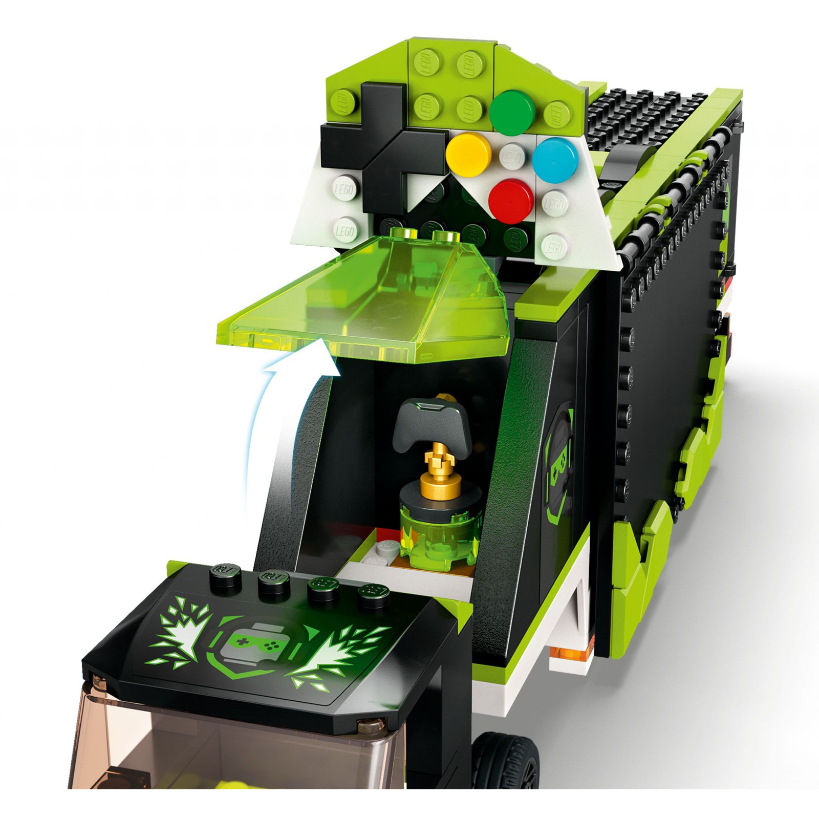 LEGO City Вантажівка для ігрового туру містить безліч деталей для ігрових уявлень. Відкрийте причеп, щоб побачити сцену з двома ігровими комп’ютерними ігровими станціями та екран стадіону з функцією веселої «анімації», а також призом переможця й крутим мерчем для шанувальників кіберспорту LEGO City. Просто додайте ведучого та ігрові мініфігурки, і починайте турнір!