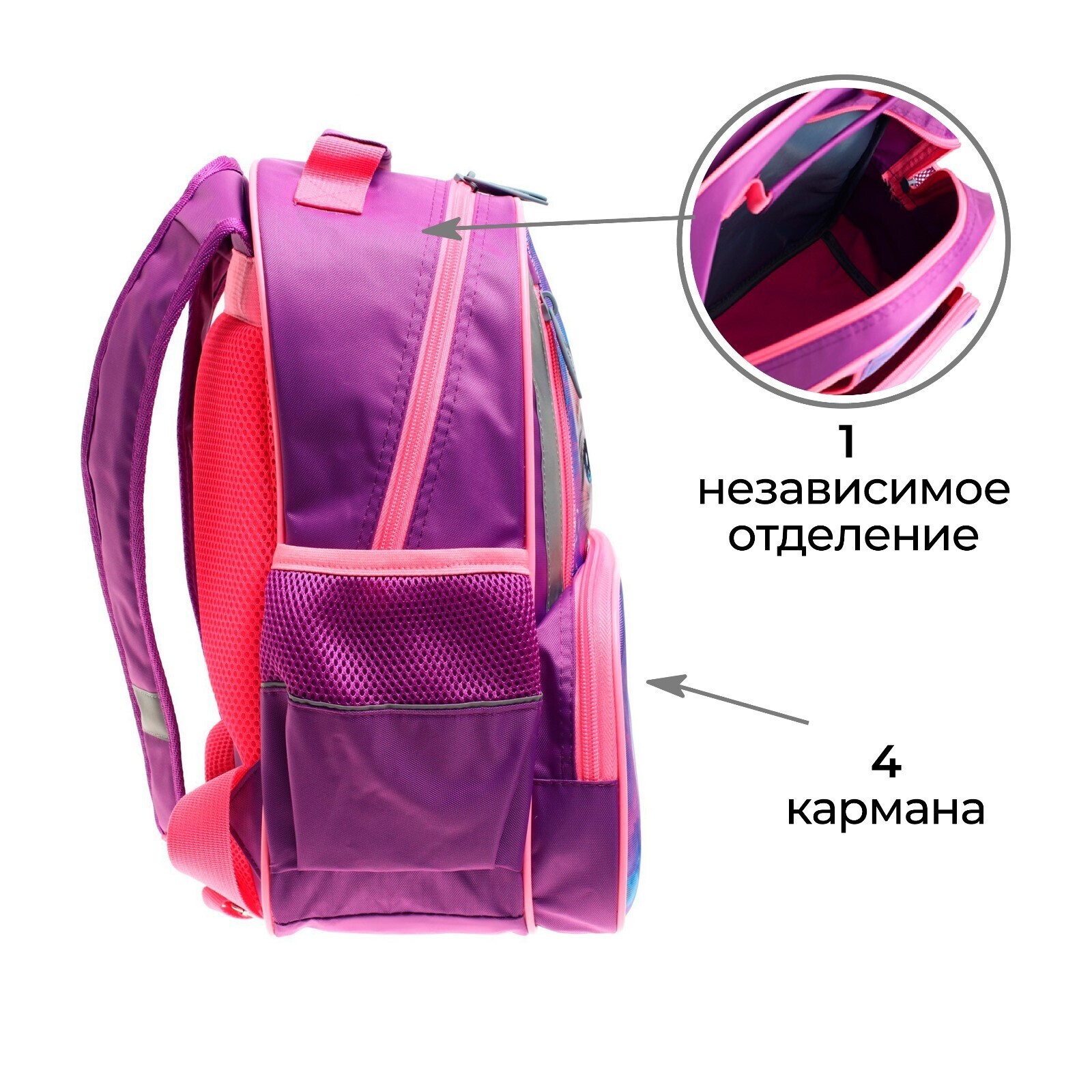 Ученический рюкзак для младшего школьного возраста предназначен для переноски личных вещей и школьных принадлежностей. Ранец выполнен из прочного непромокаемого материала с покрытием ПВХ. Оригинальный дизайн на фронтальной поверхности изделия.