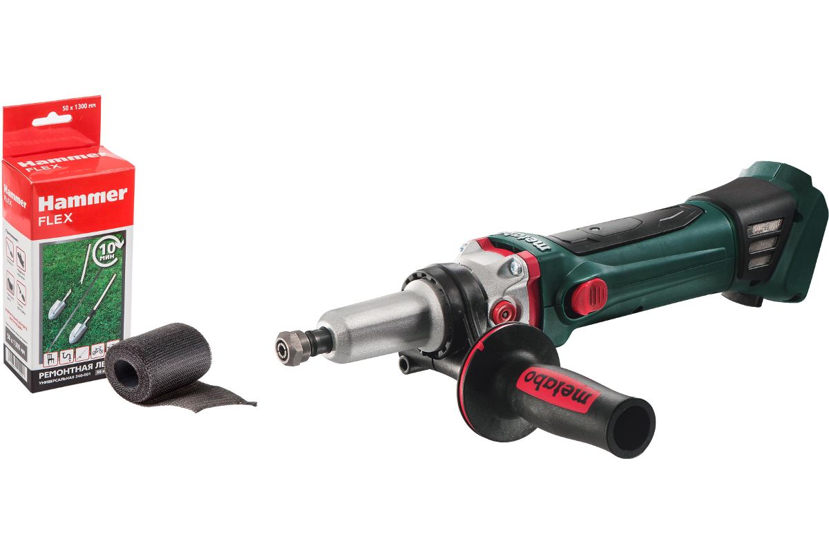 В состав набора входят: Машинка шлифовальная прямая METABO GA 18 LTX G (600639850) 18В LiION без акк 6000об/мин, Ремонтная лента Hammer Flex 240-001 универсальная