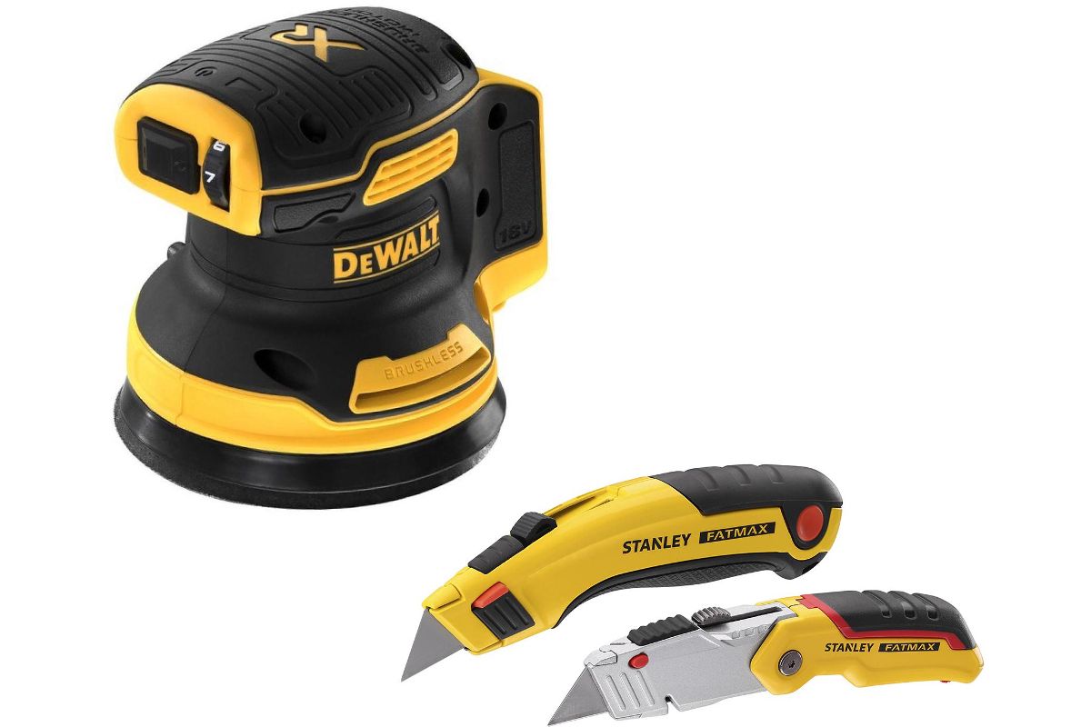 В состав набора входят: Эксцентриковая орбитальная шлифмашина DEWALT DCW210N, Набор из 2х ножей Stanley FatMax FMHT82836-0