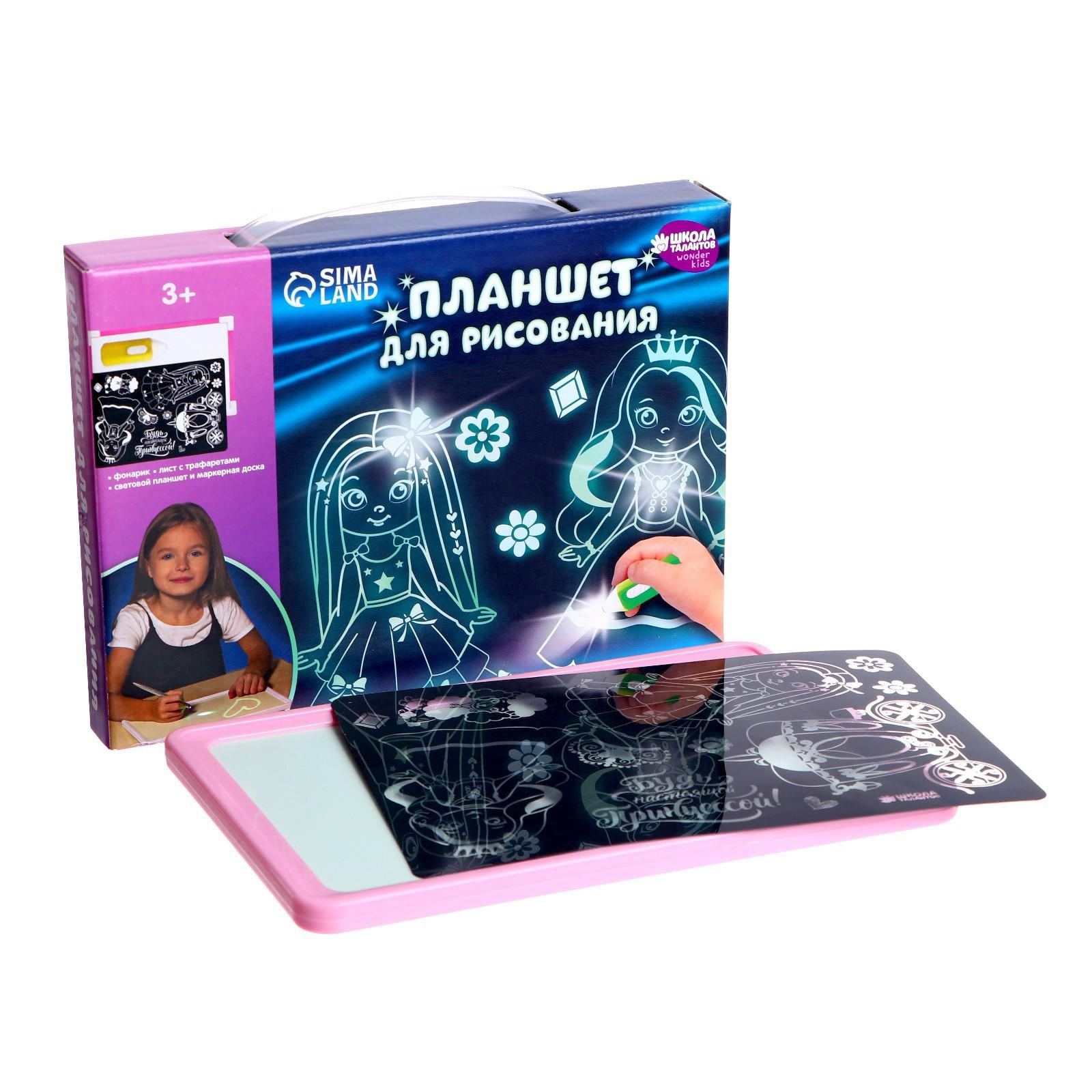 С помощью такой доски кроха сможет опробовать рисование светом. Для этого поместите планшет в тёмное место, удерживайте кнопку на маркере-фонарике и ведите его по поверхности. Ребёнок может использовать трафарет или придумать собственные сюжеты. Чем ближе вы держите маркер к планшету, тем ярче будет изображение.