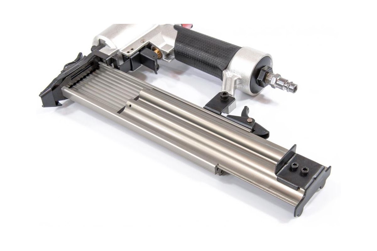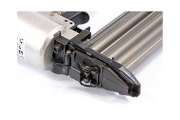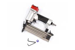 Пневматический нейлер для гвоздей помогает быстро и надежно крепить паркетные доски, фанеру, гипсокартон, кожу и т.д. Рукоять удобной формы снабжена нескользящим покрытием для надежного удержания инструмента без проскальзывания руки. Модель работает с гвоздями длиной 10-50 мм. Емкость магазина составляет 100 штук.