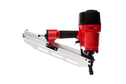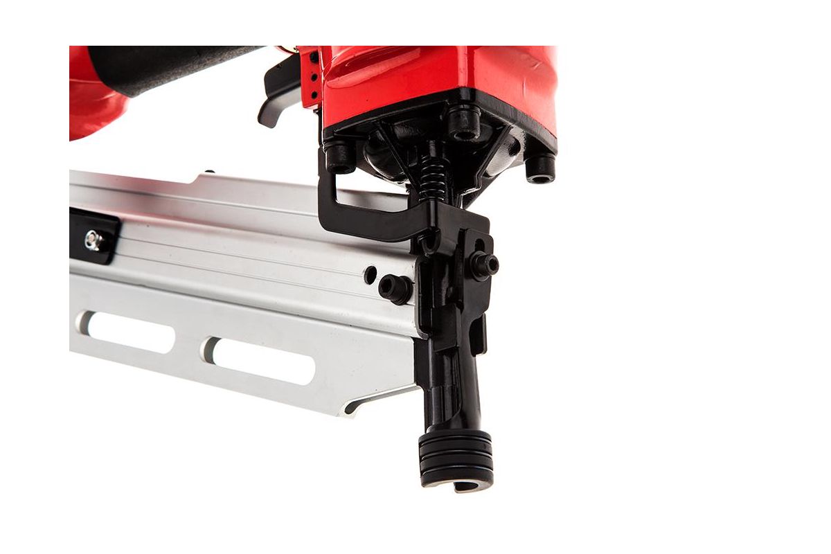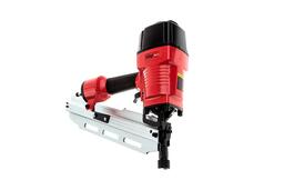 Гвоздезабивной пистолет широко используется для стяжки полов, крепления листовых материалов, сборки каркасов деревянных домов и прочего. Магазин расположен под углом к обрабатываемой поверхности. Он вмещает 50 гвоздей.