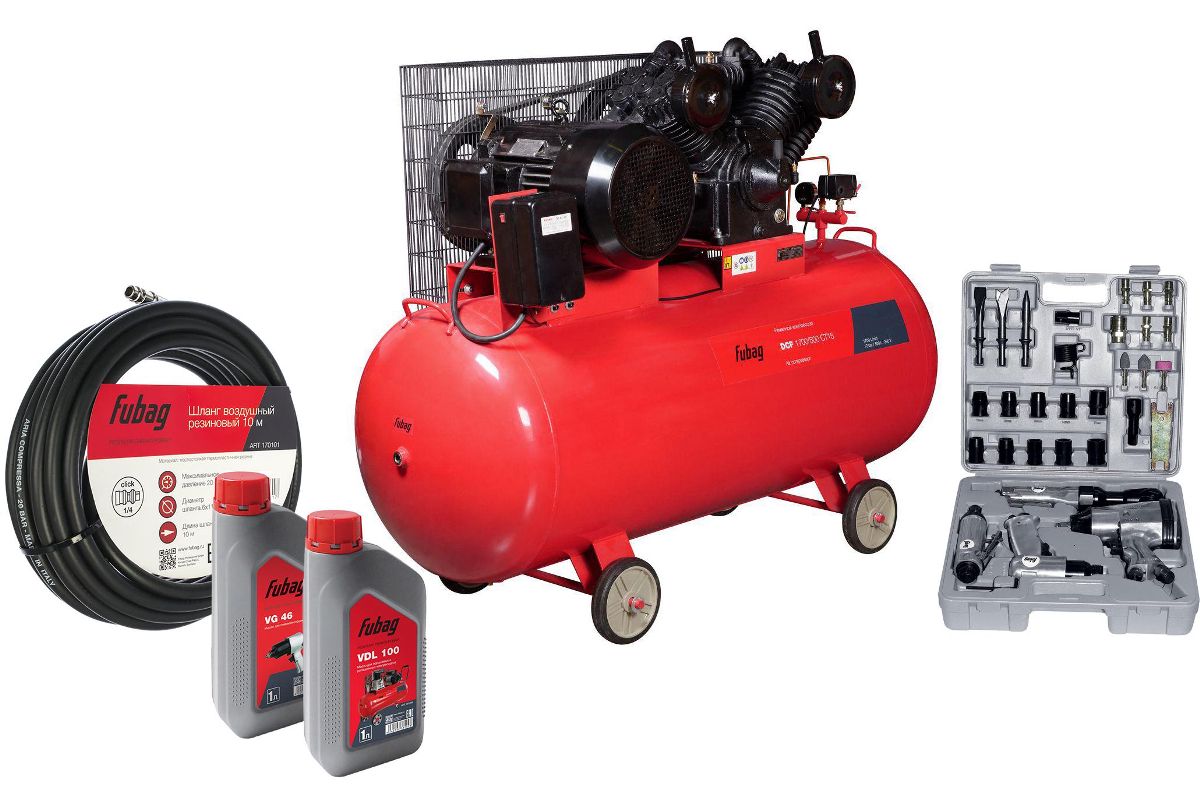 В состав набора входят: Компрессор FUBAG DCF-1700/500 СТ15 поршневой масляный, Вт, 1700л/мин, 10бар, Масло компрессорное FUBAG VG 46 838271 для пневмоинструмента 1литр, Масло FUBAG VDL 100 для поршневых компрессоров 1л, Шланг FUBAG 170101 с фитингами рапид 10 м; 6x11 мм, Набор пневмоинструмента FUBAG 120103 34 предмета кейс