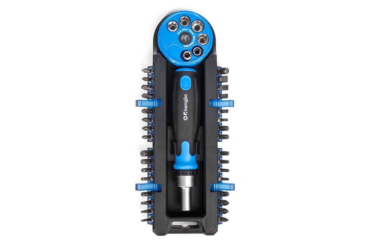 Набор состоит из реверсивной отвертки с битами, поставляется в пластиковом пенале.