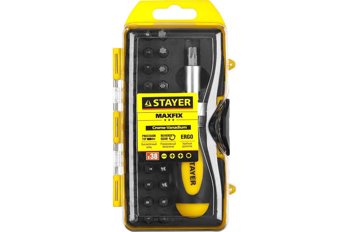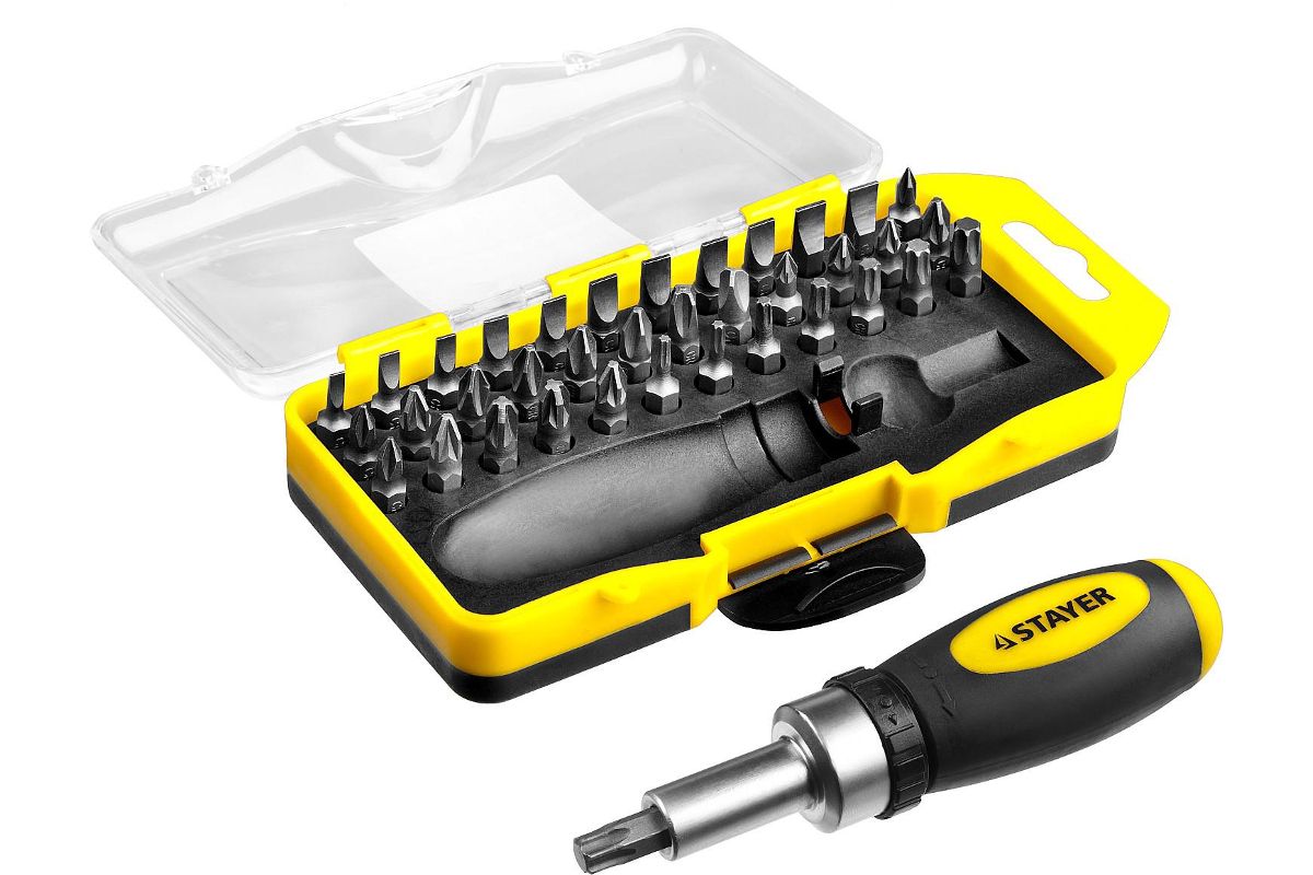 Реверсивная отвертка в наборе с битами STAYER 2557-H38 (38 предметов)
