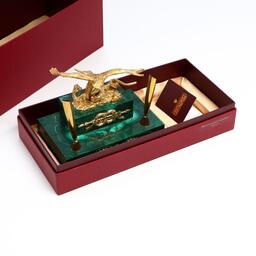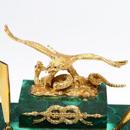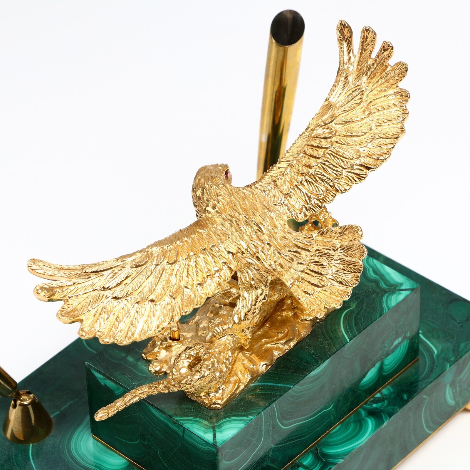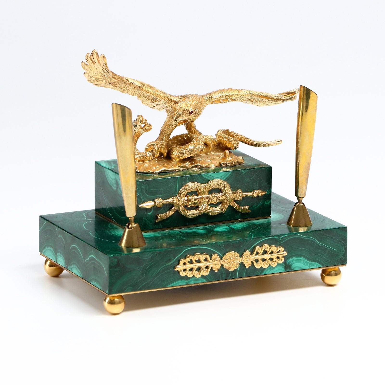 Изделия российской марки «Сентябревъ» - официального поставщика Российского Императорского Дома – не просто предметы интерьера. Это настоящие произведения искусства, изысканная красота которых преображает окружающее пространство, придавая ему еще больше великолепия. Этот роскошный письменный прибор сделан из малахита с его неповторимыми разводами всевозможных оттенков зеленого и декорирован позолоченной бронзой. Уникальный бизнес-подарок, стильный и статусный, который станет настоящим украшением рабочего кабинета, подчеркивающим высокое положение, которое занимает его обладатель.