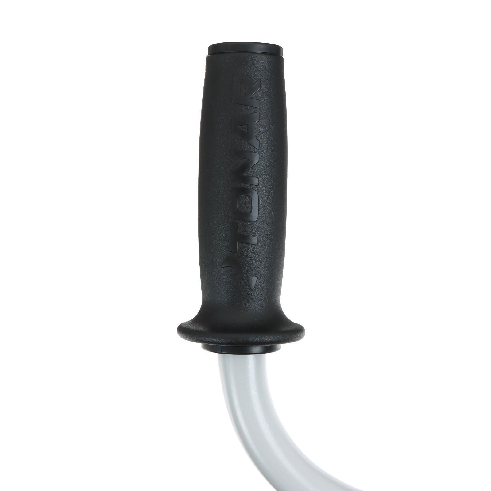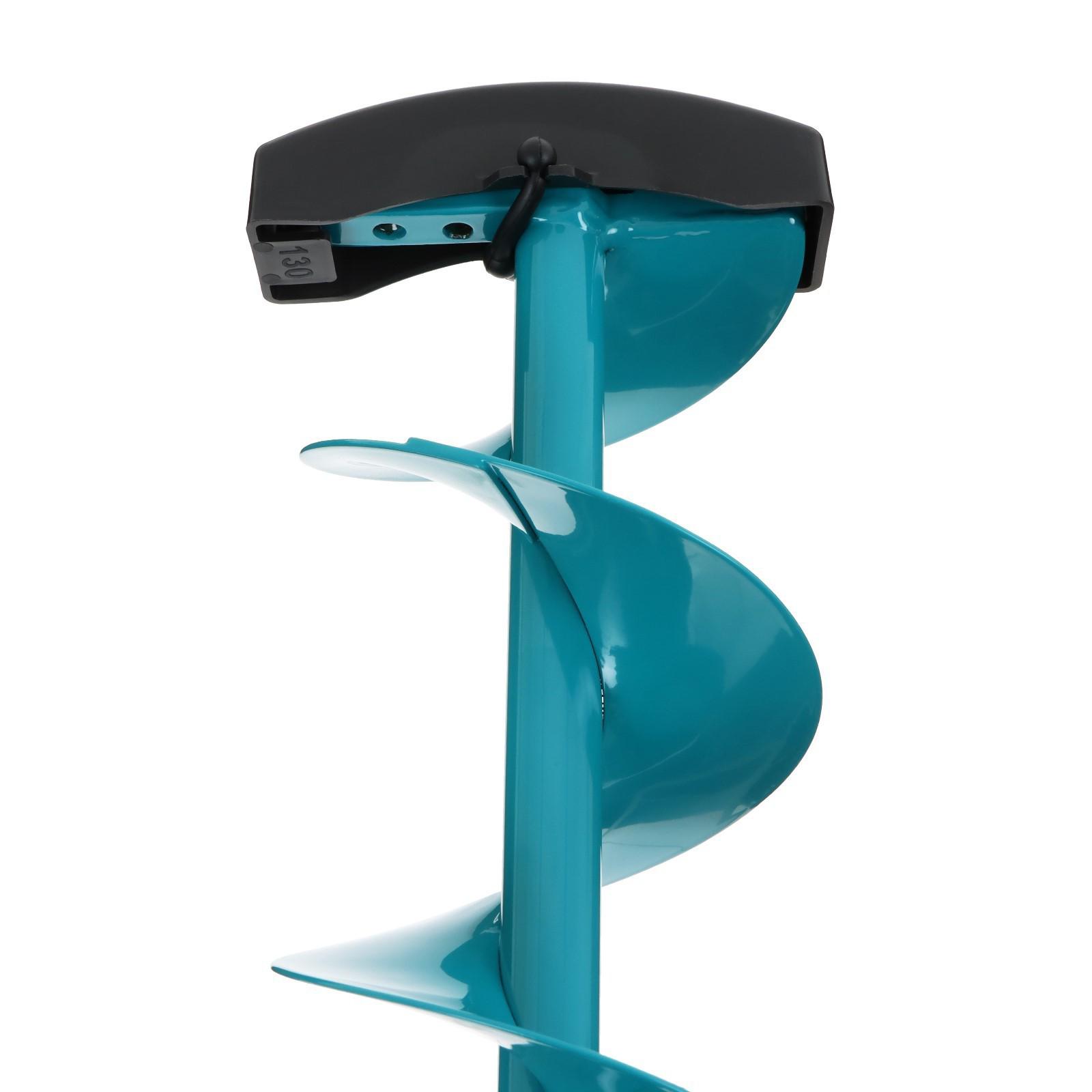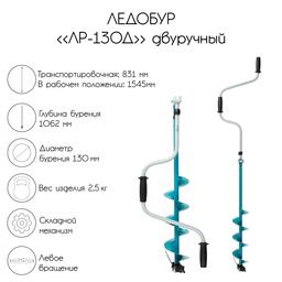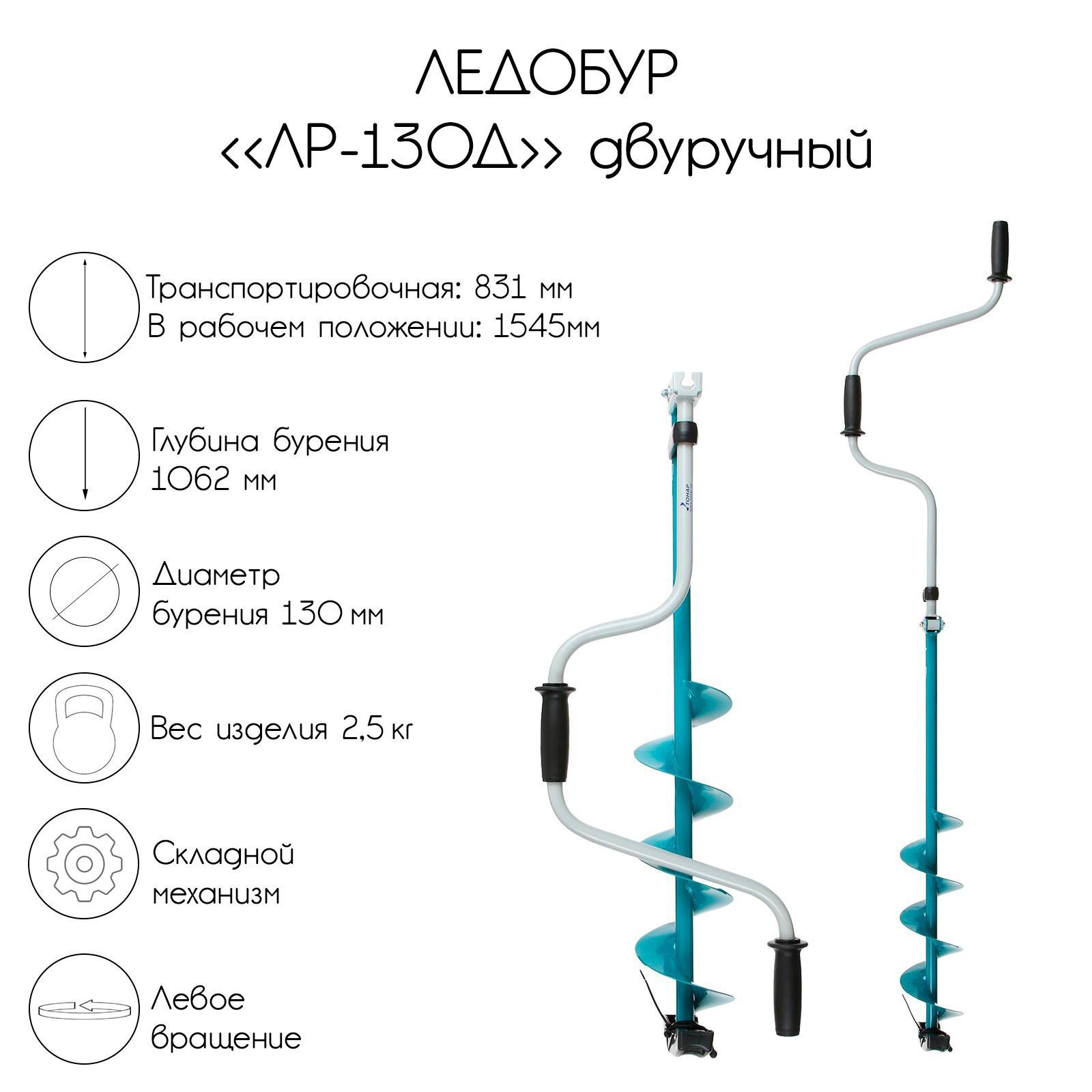 Верхняя рукоятка Ледобура ЛР-130Д смещена относительно оси шнека на 130 мм, а нижняя на 150 мм. Скорость бурения возрастает, а нагрузка равномерно распределяется на две руки и становится незаметной. Поскольку ход бура при таком бурении плавный (без рывков), нет эффекта «закусывания» при прохождении нижней кромки льда.